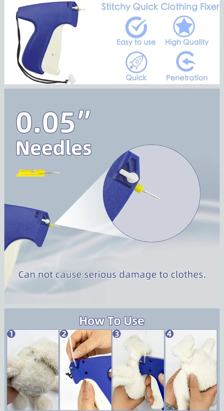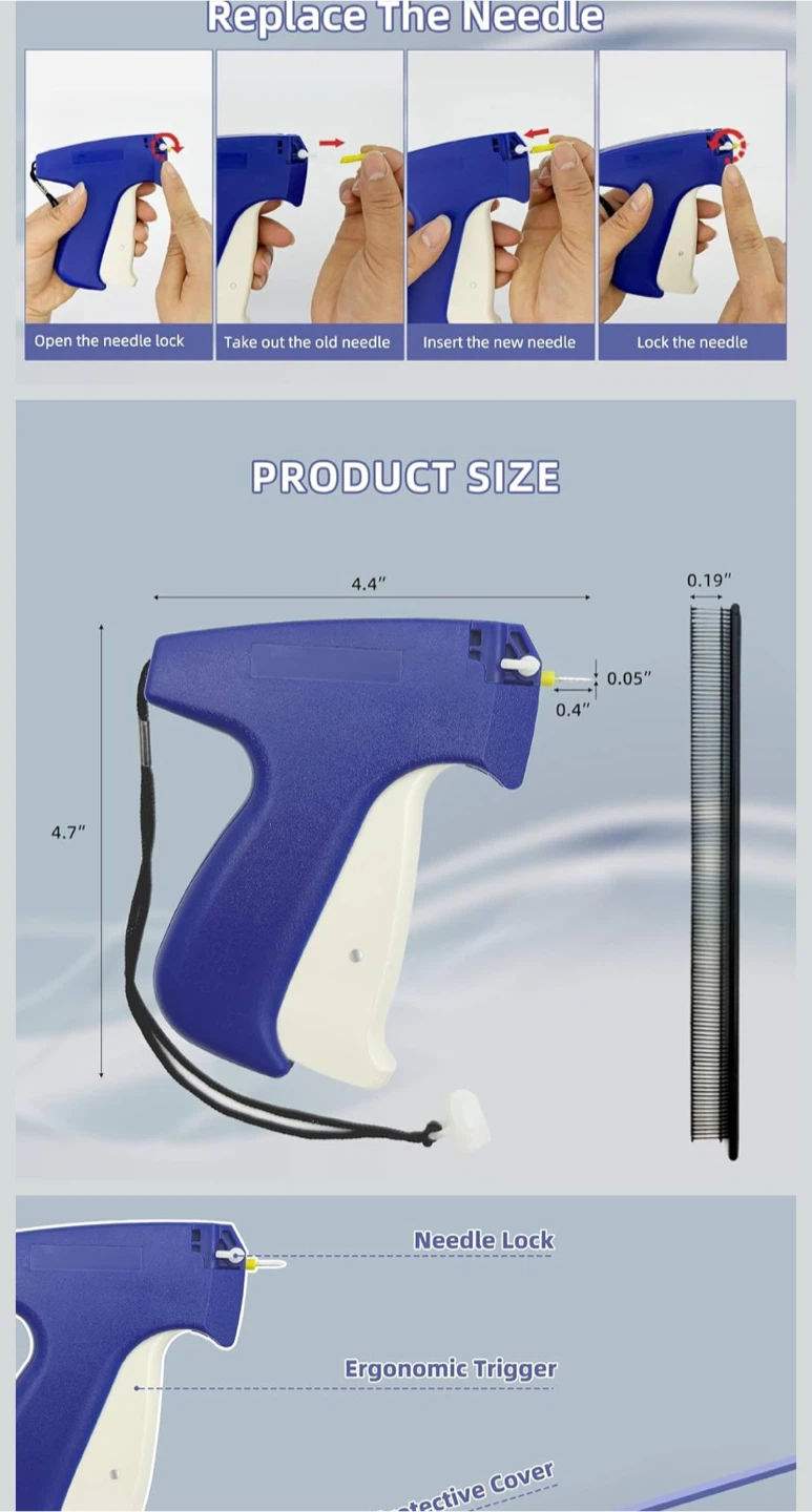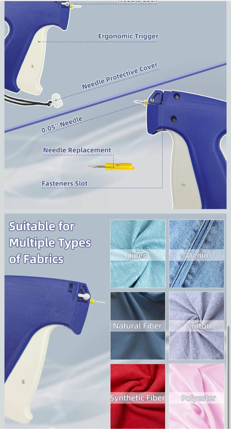 Hangtag tagging gun, model S-3.7, perfect for attaching tags to clothing and other items. Suitable for multiple types of fabrics including linen, denim, natural fibre, cotton, synthetic fibre and polyester. Comes with a pack of fasteners and replacement needles