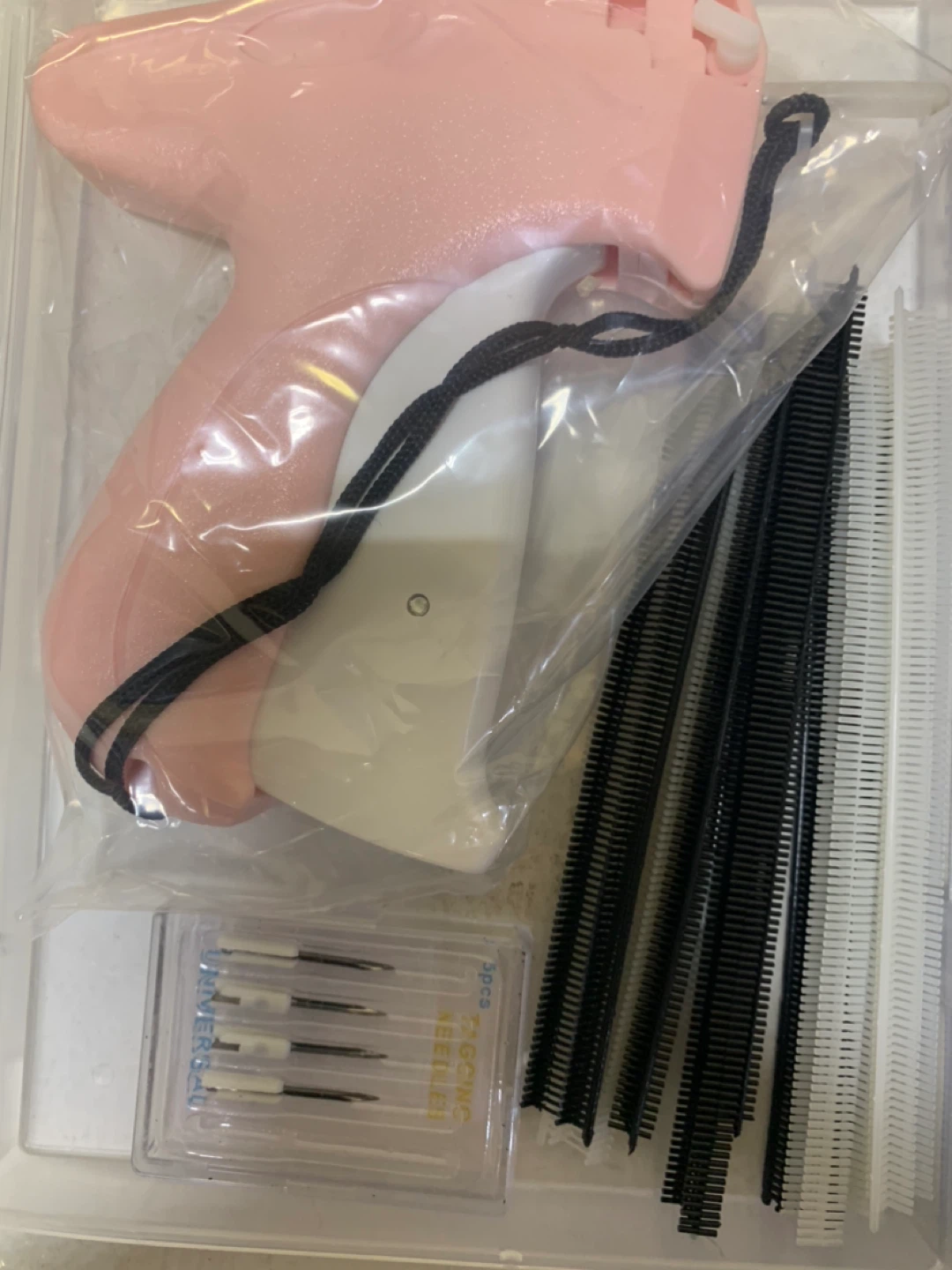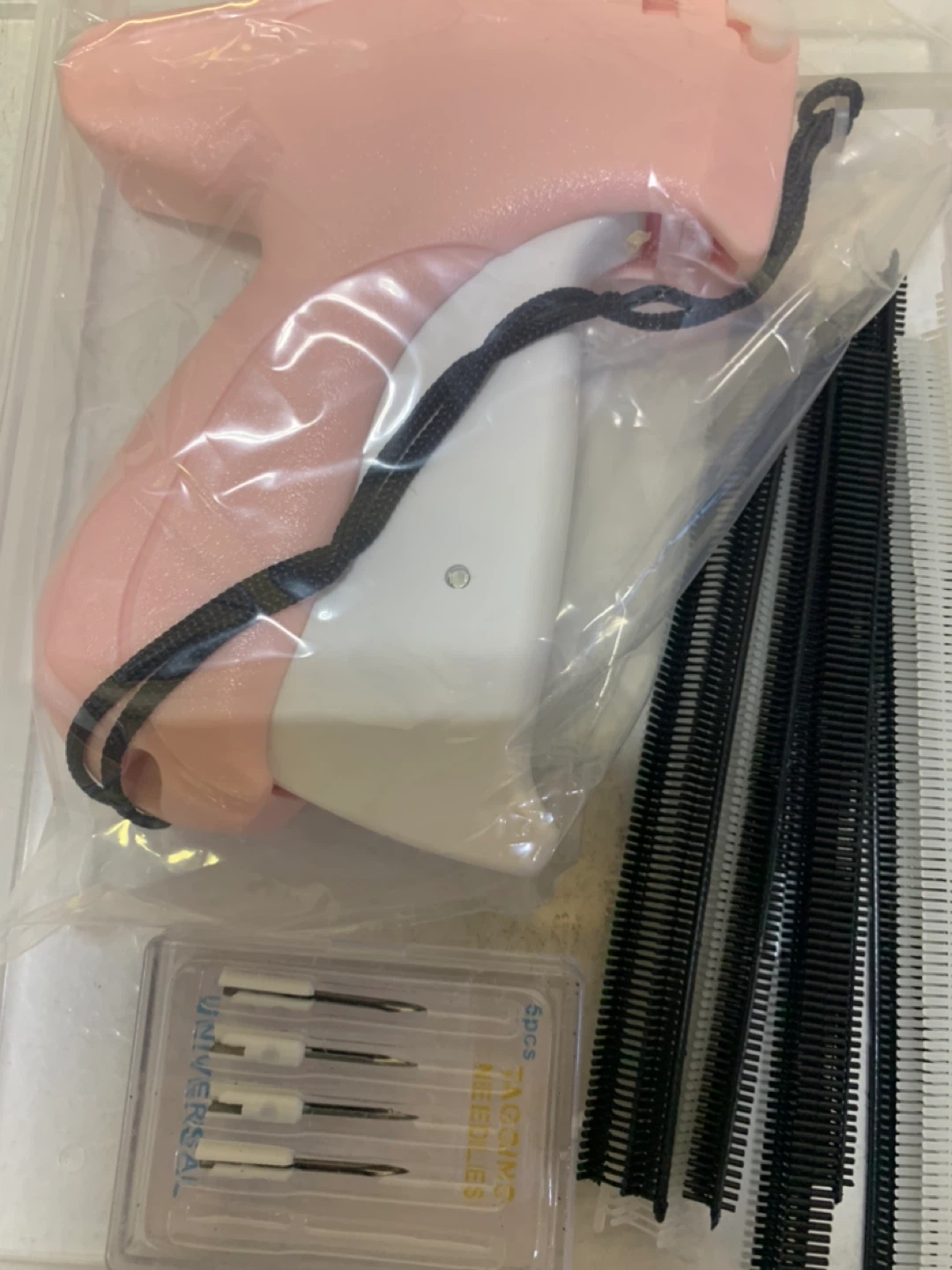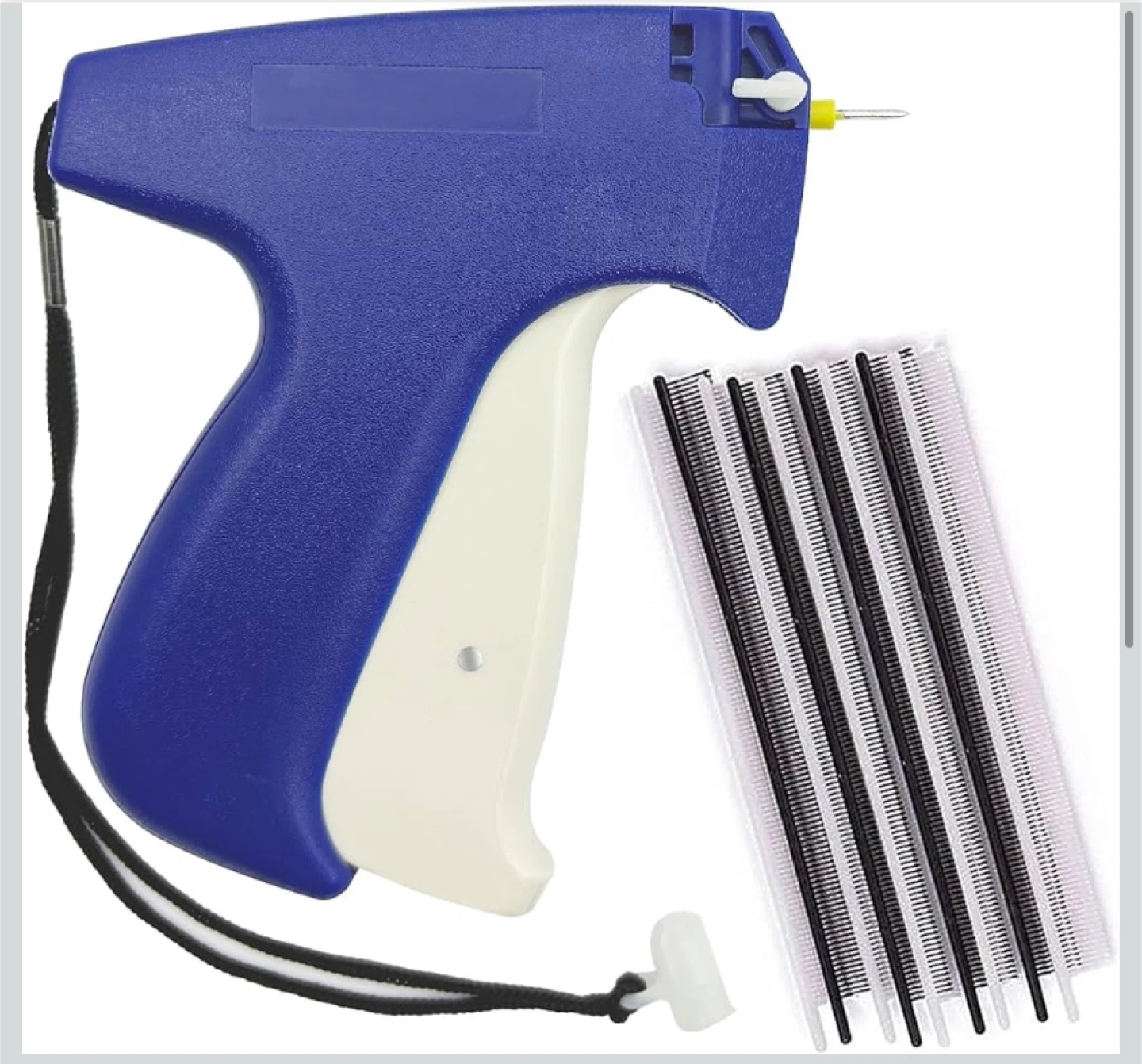 Hangtag tagging gun, model S-3.7, perfect for attaching tags to clothing and other items. Suitable for multiple types of fabrics including linen, denim, natural fibre, cotton, synthetic fibre and polyester. Comes with a pack of fasteners and replacement needles