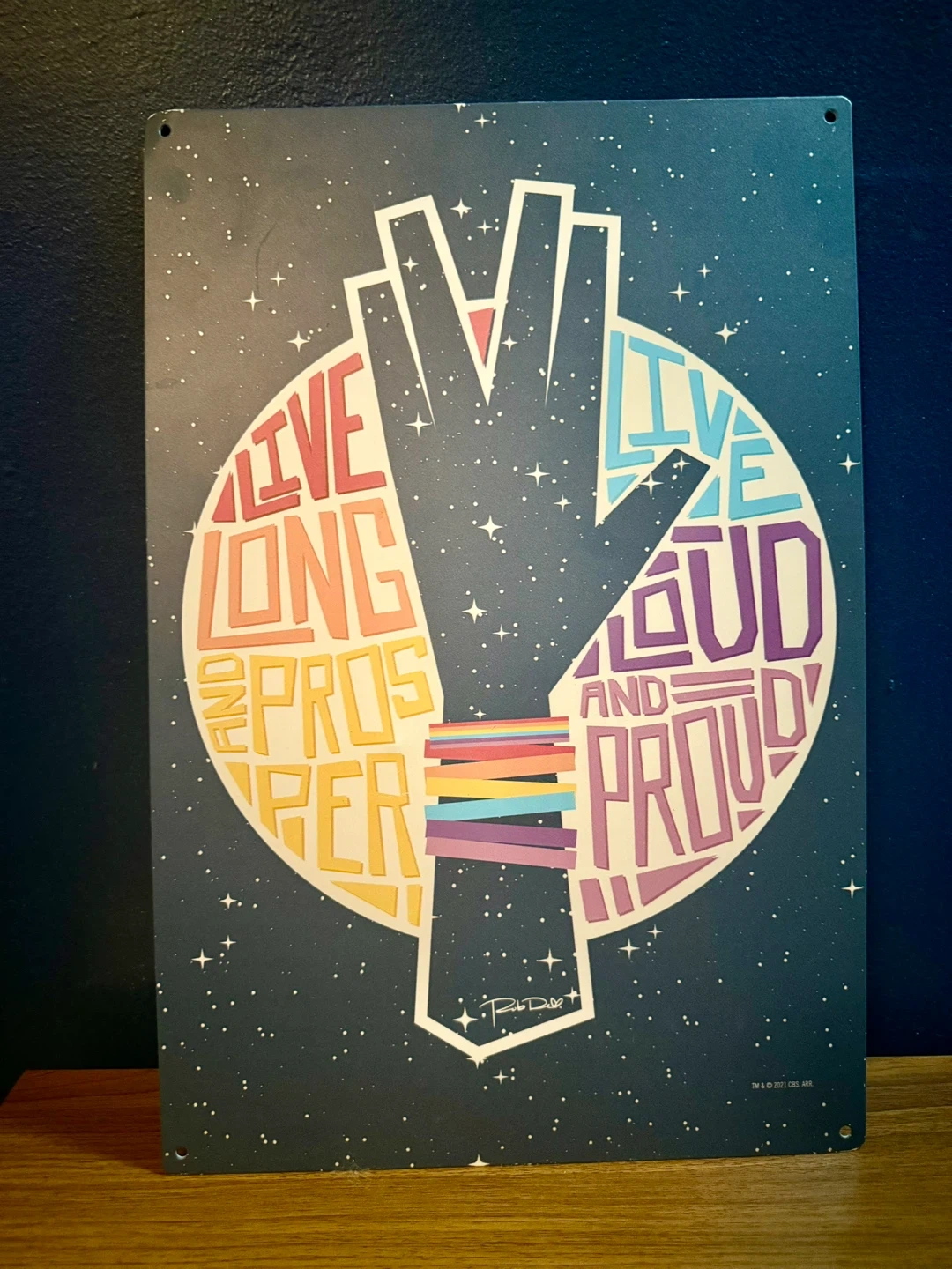 Selling a Rob DeHeart Star Trek metal sign featuring the Vulcan salute with the words 'Live Long and Prosper' and 'Live Loud and Proud'. It's in great condition and ready to add some Trek-Pride flair to your space!
