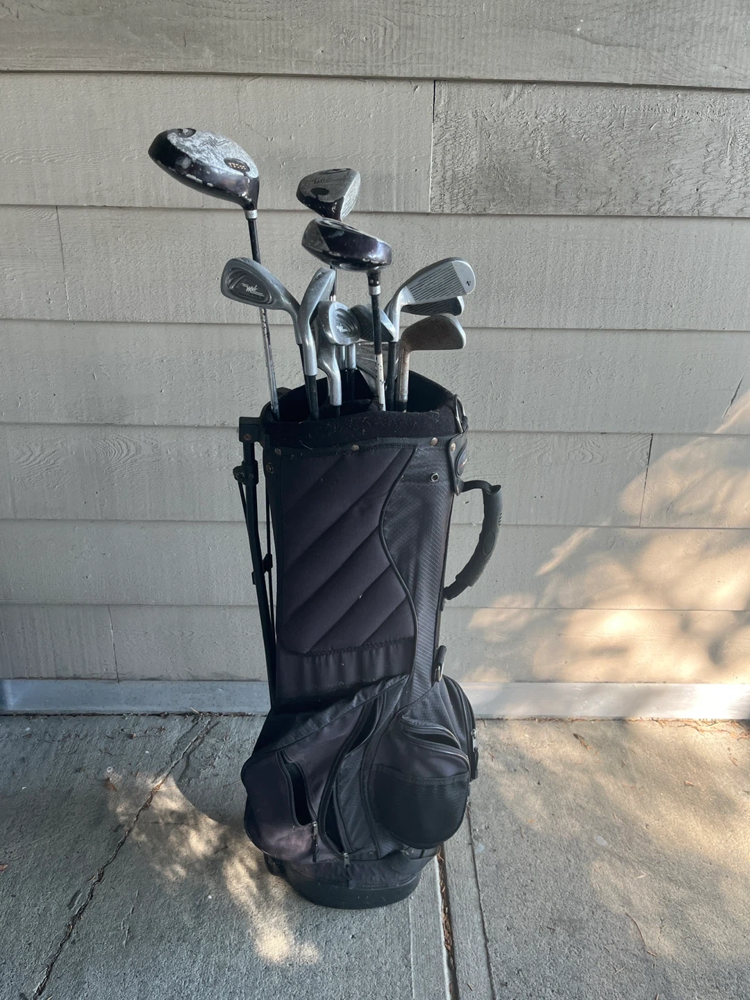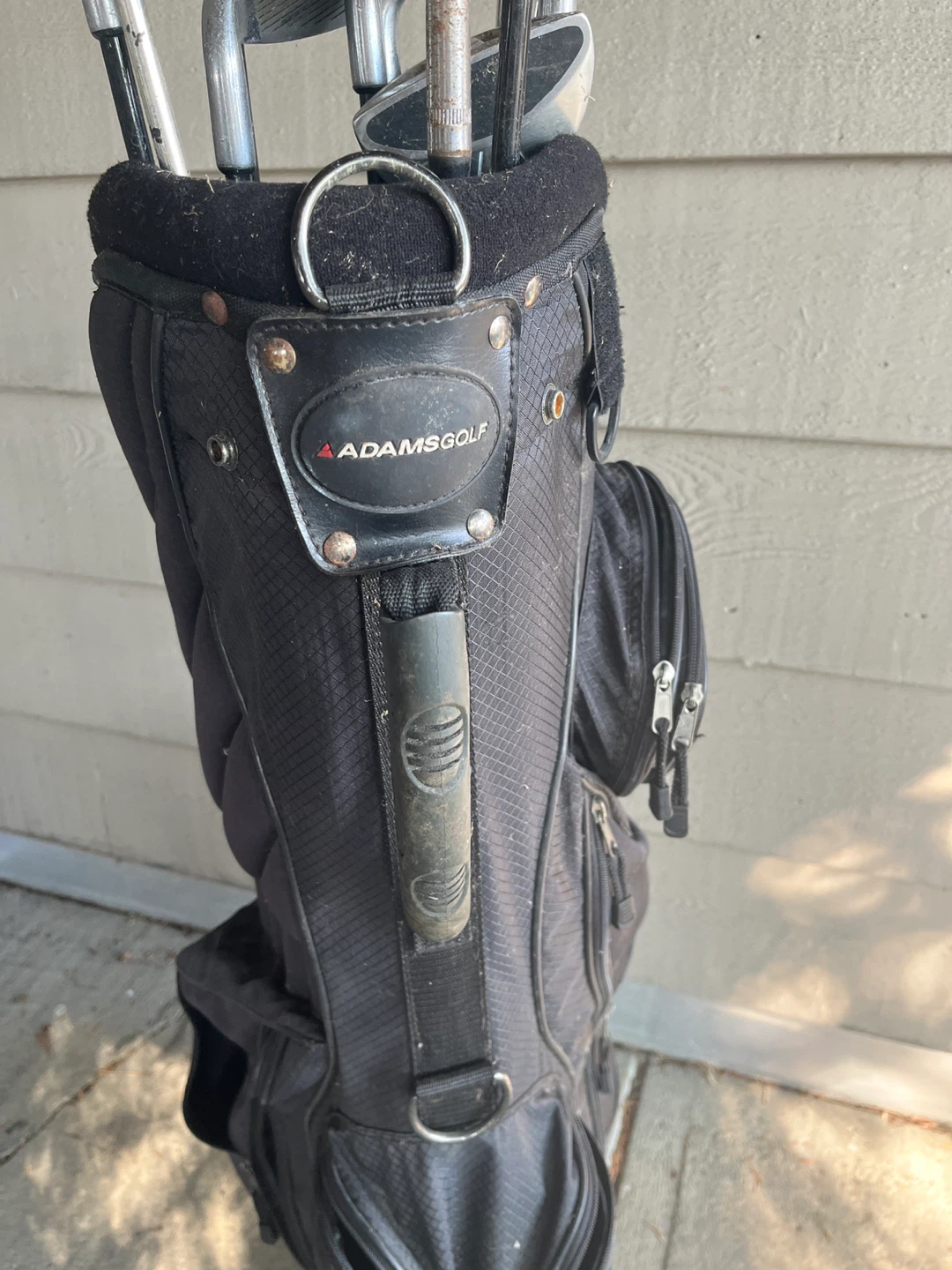 Selling a set of golf clubs with an Adams Golf bag. The set includes various clubs and some Pinnacle golf balls. Ready for the green!