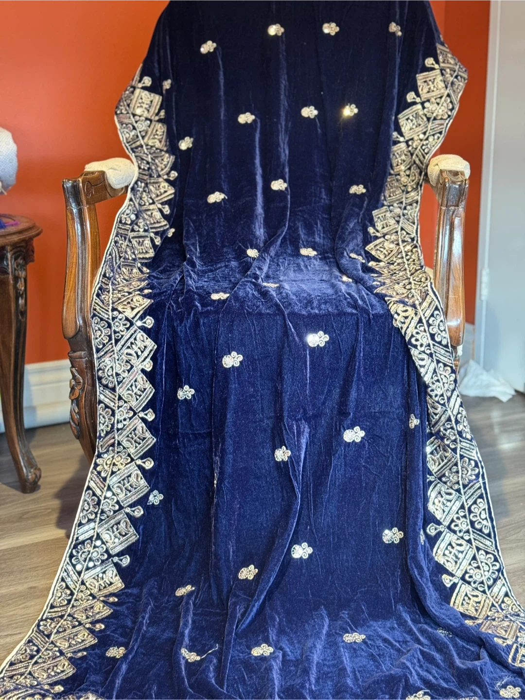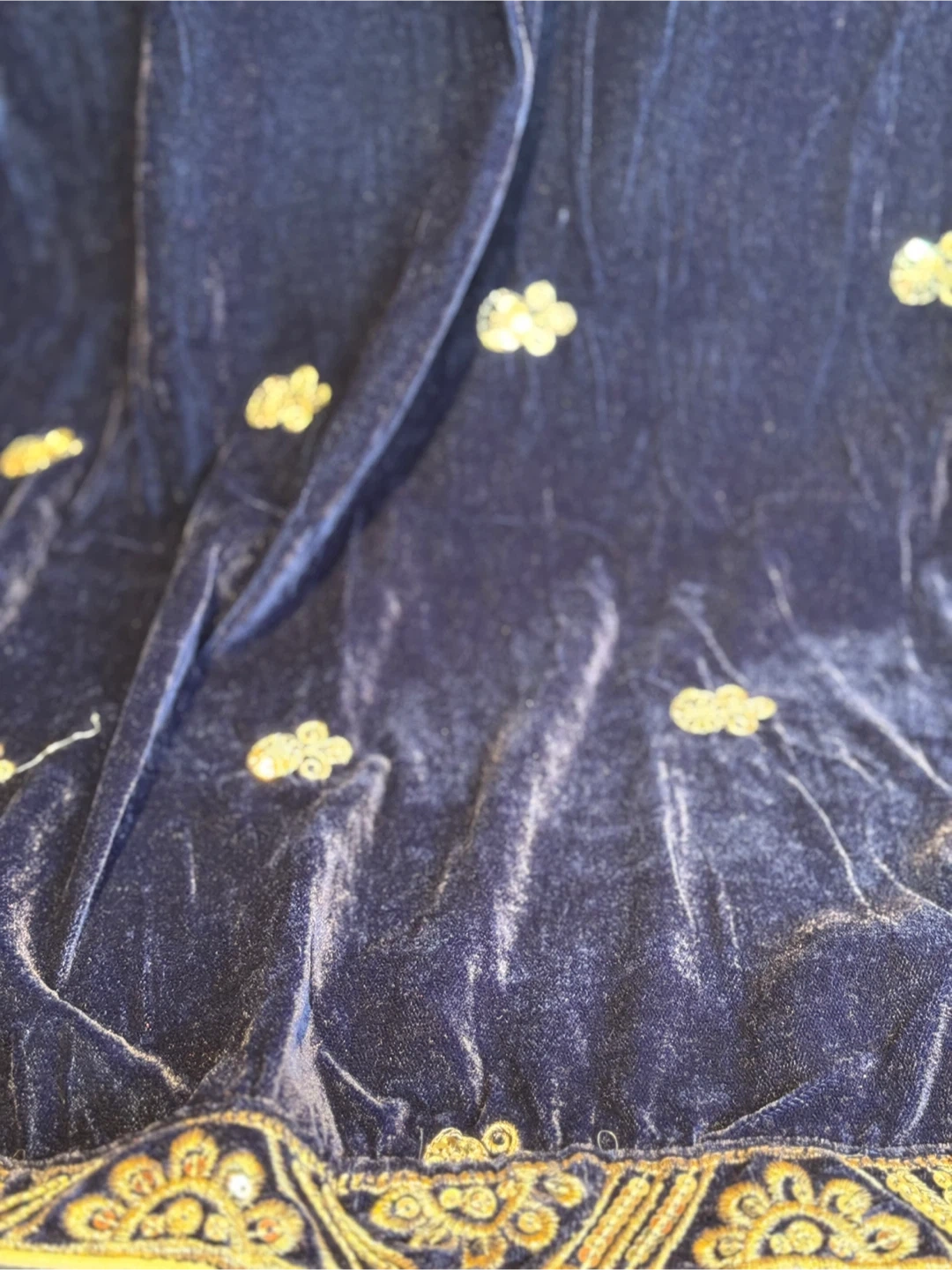 Beautiful blue velvet shawl with gold embroidery! It's new and would be perfect for adding a touch of elegance to any outfit