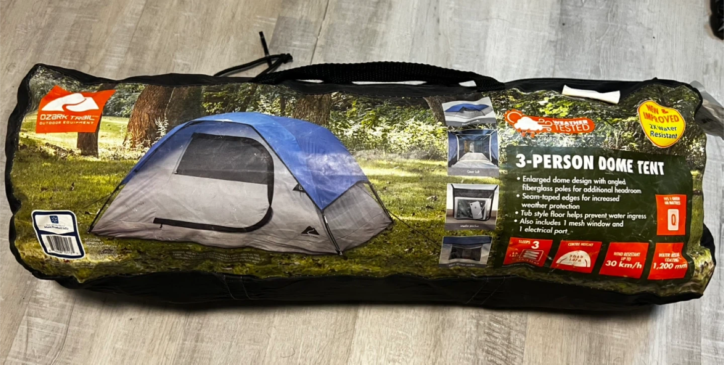 Selling an Ozark Trail 3-person dome tent! It features an enlarged dome design with angled fiberglass poles for additional headroom. It also has seam-taped edges for increased weather protection and a tub-style floor to help prevent water from getting in. There's also a mesh window and an electrical port for your convenience