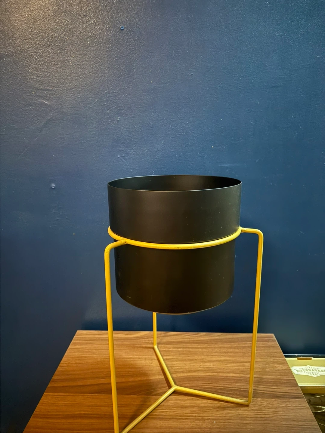 Here's a stylish metal plant stand with a black planter and gold stand. It's perfect for adding a modern touch to your home decor! The stand is sturdy and the planter is a great size for small to medium-sized plants