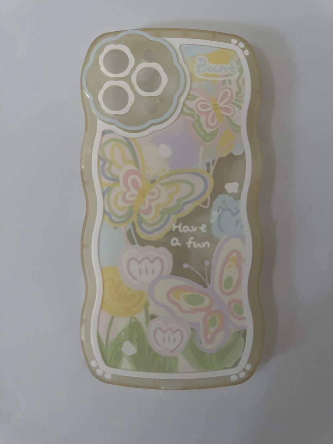 Selling a cute iPhone case with a butterfly and floral design! It has a wavy edge and a cutout that says "Have a fun". It's in good condition and ready for a new home
