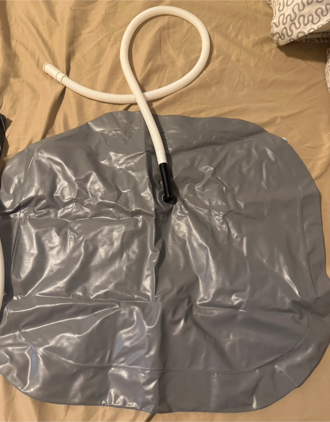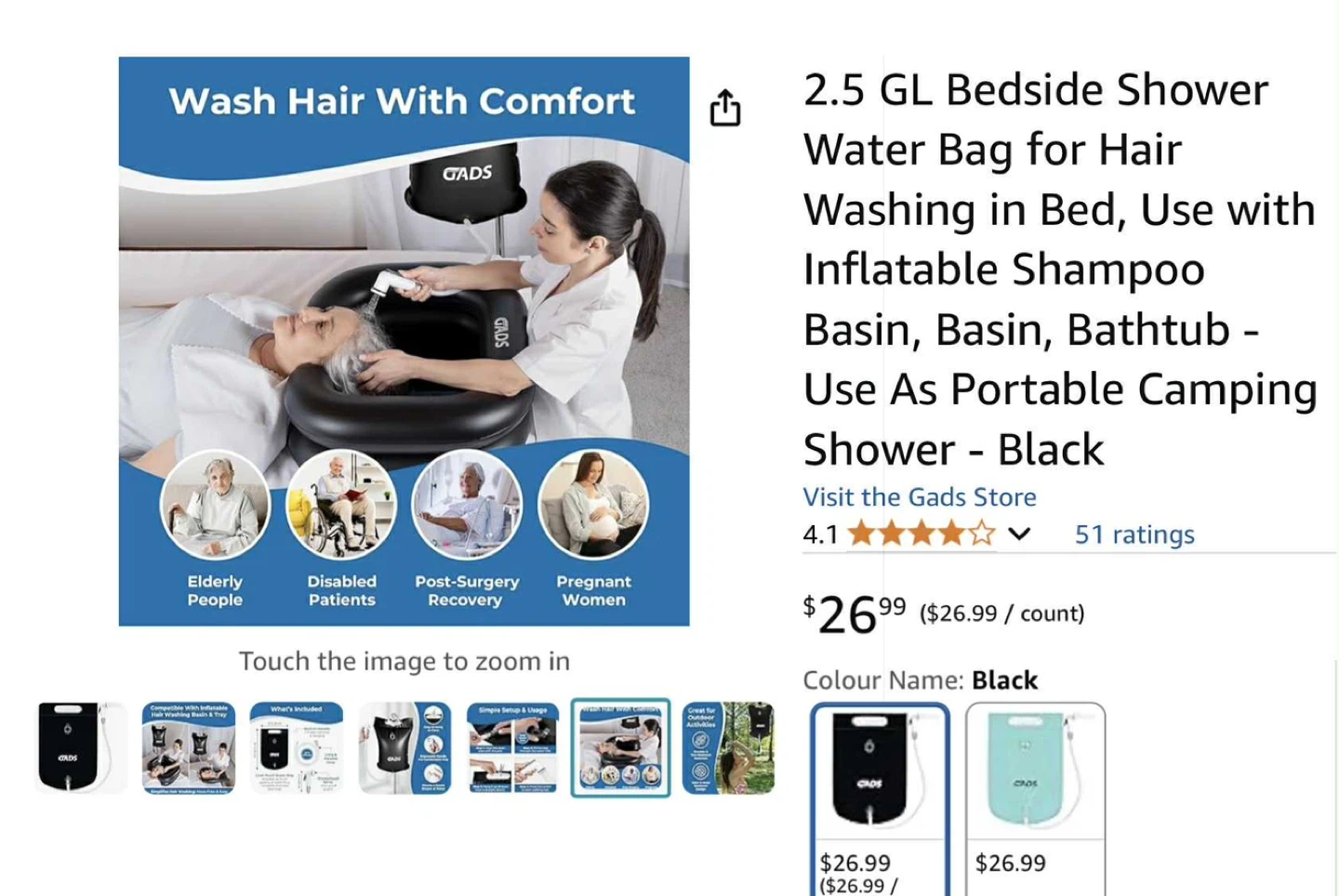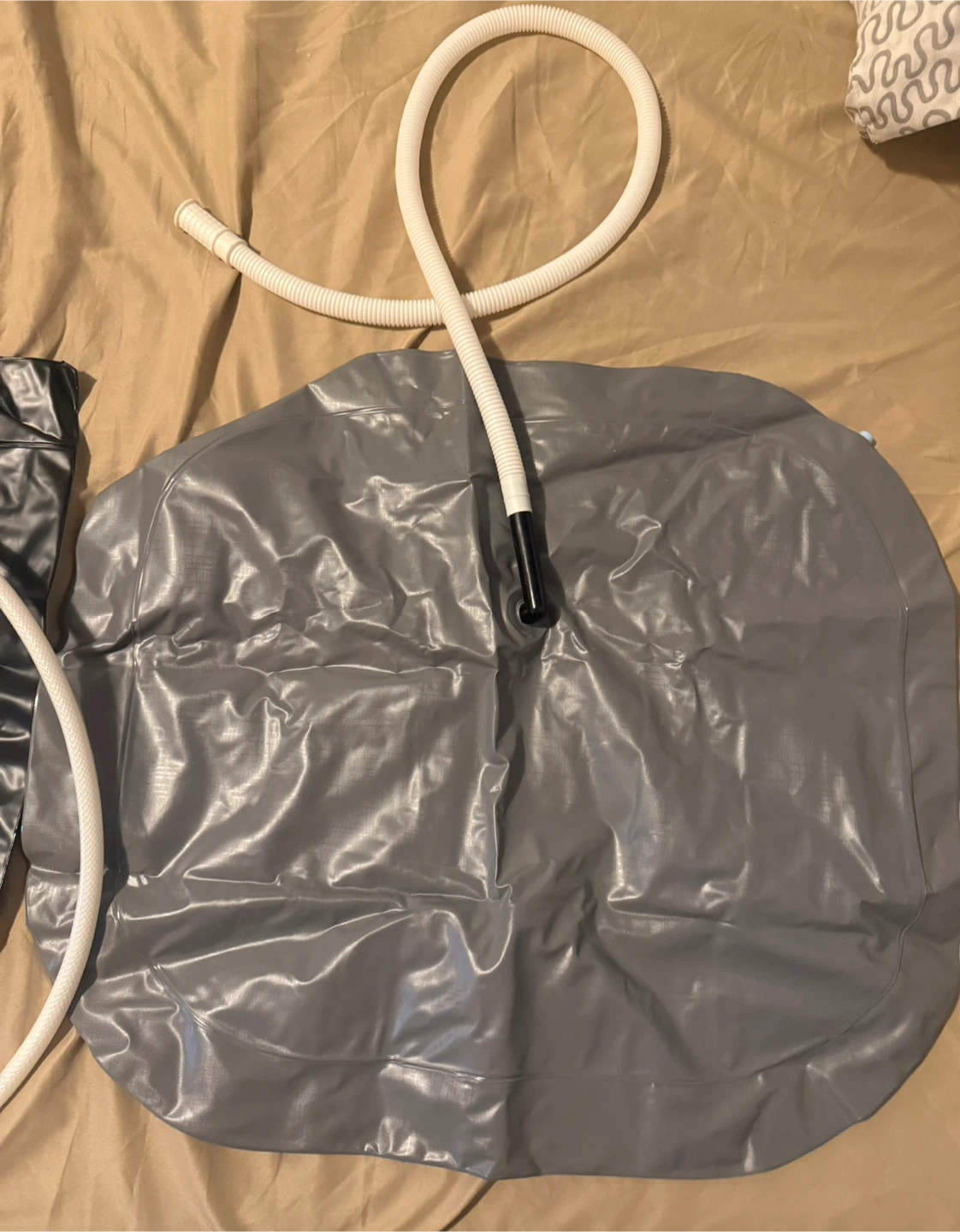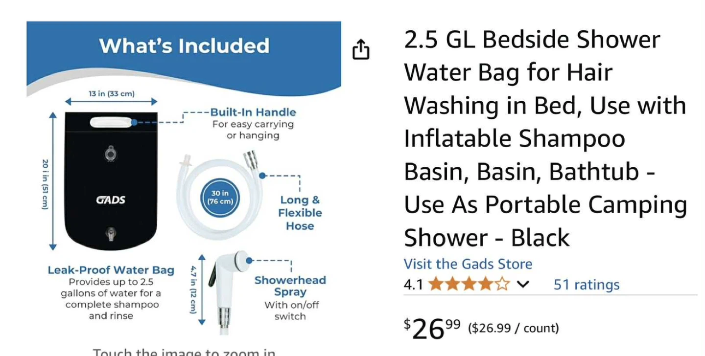 Selling a Gads 2.5 GL bedside shower water bag in black! This portable camping shower is designed for hair washing in bed or use with an inflatable shampoo basin.