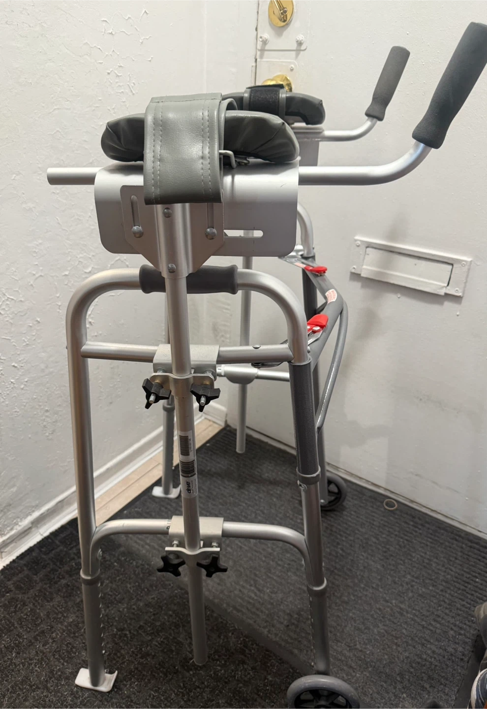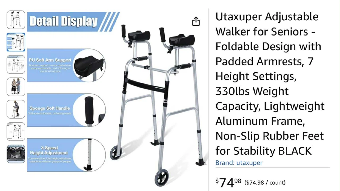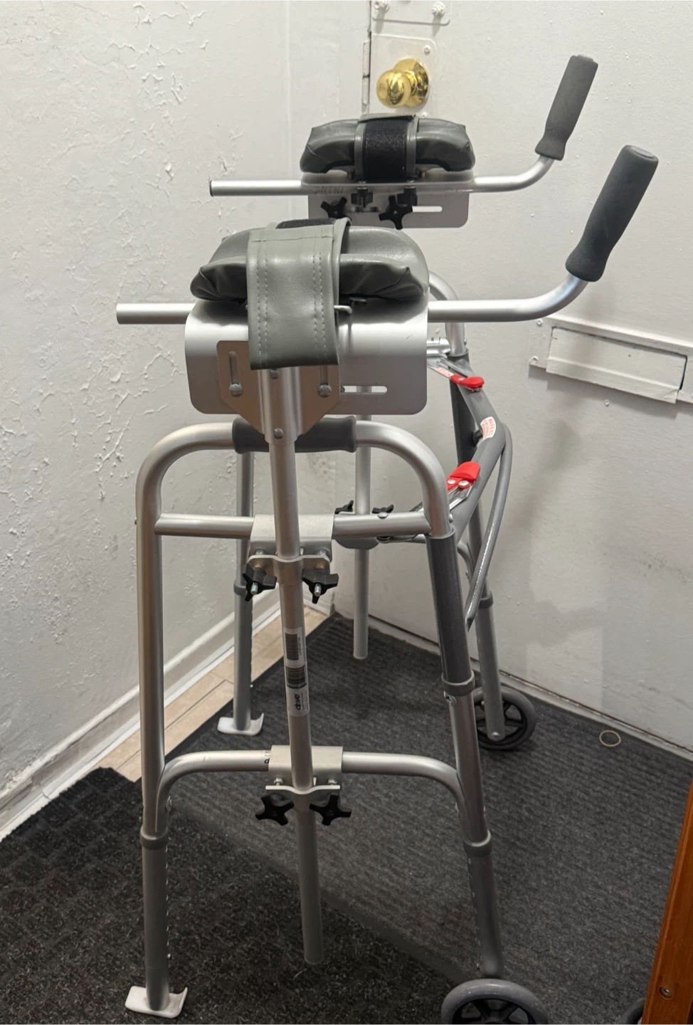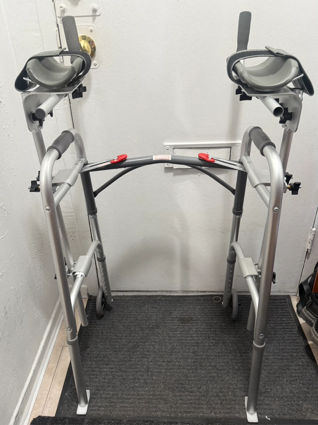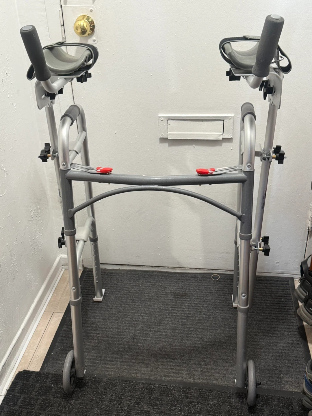 Selling an adjustable walker complete with padded armrests for extra comfort! This walker features a lightweight aluminum frame and non-slip rubber feet for stability. It's foldable for easy storage and transport. The walker has 7 height settings and a weight capacity of 330lbs. A great aid for anyone needing a little extra support