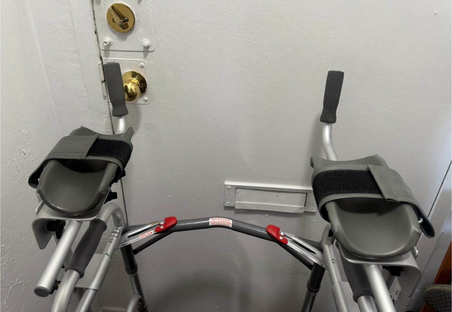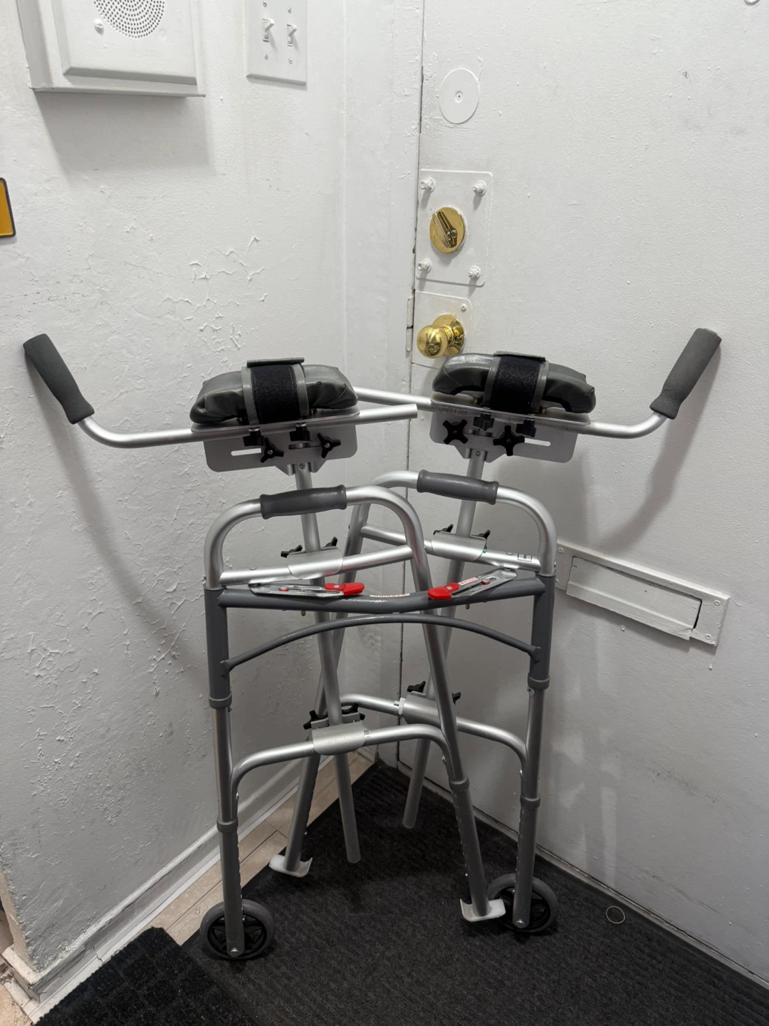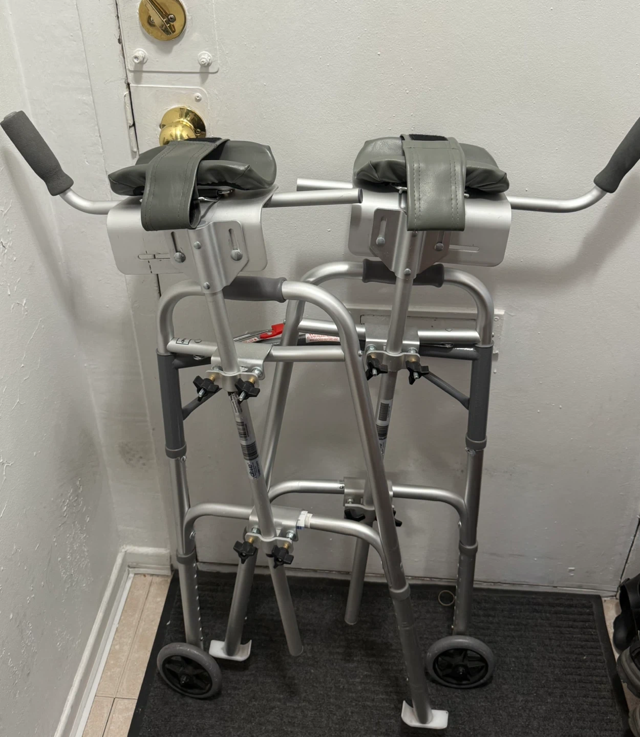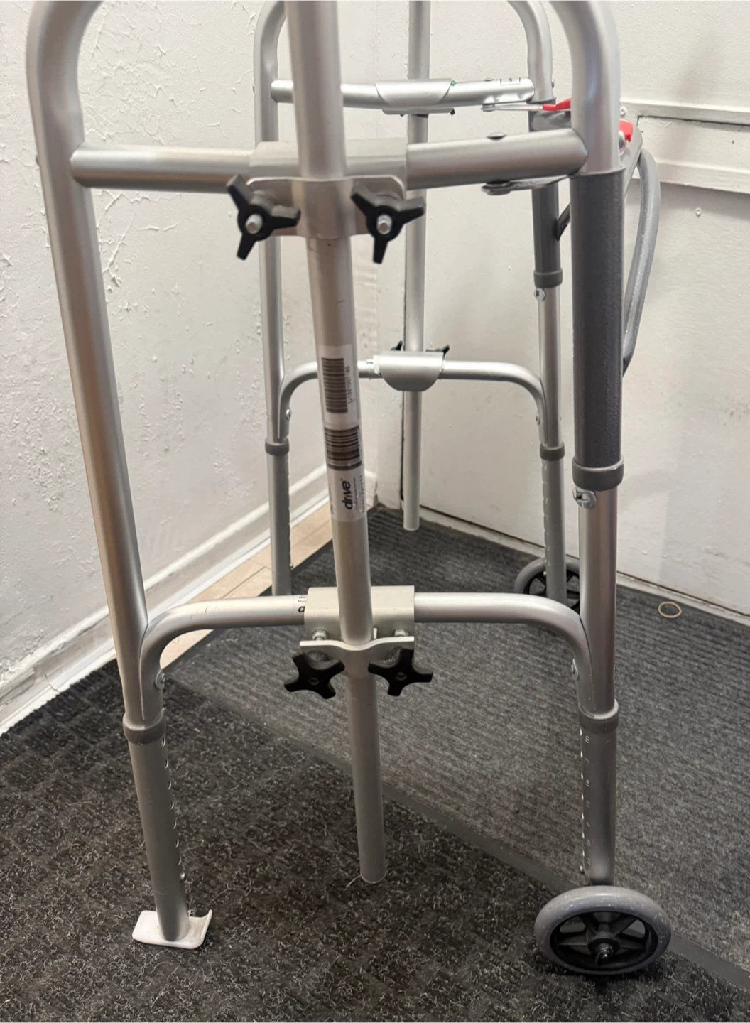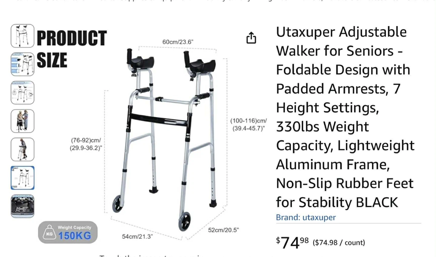 Selling an adjustable walker complete with padded armrests for extra comfort! This walker features a lightweight aluminum frame and non-slip rubber feet for stability. It's foldable for easy storage and transport. The walker has 7 height settings and a weight capacity of 330lbs. A great aid for anyone needing a little extra support