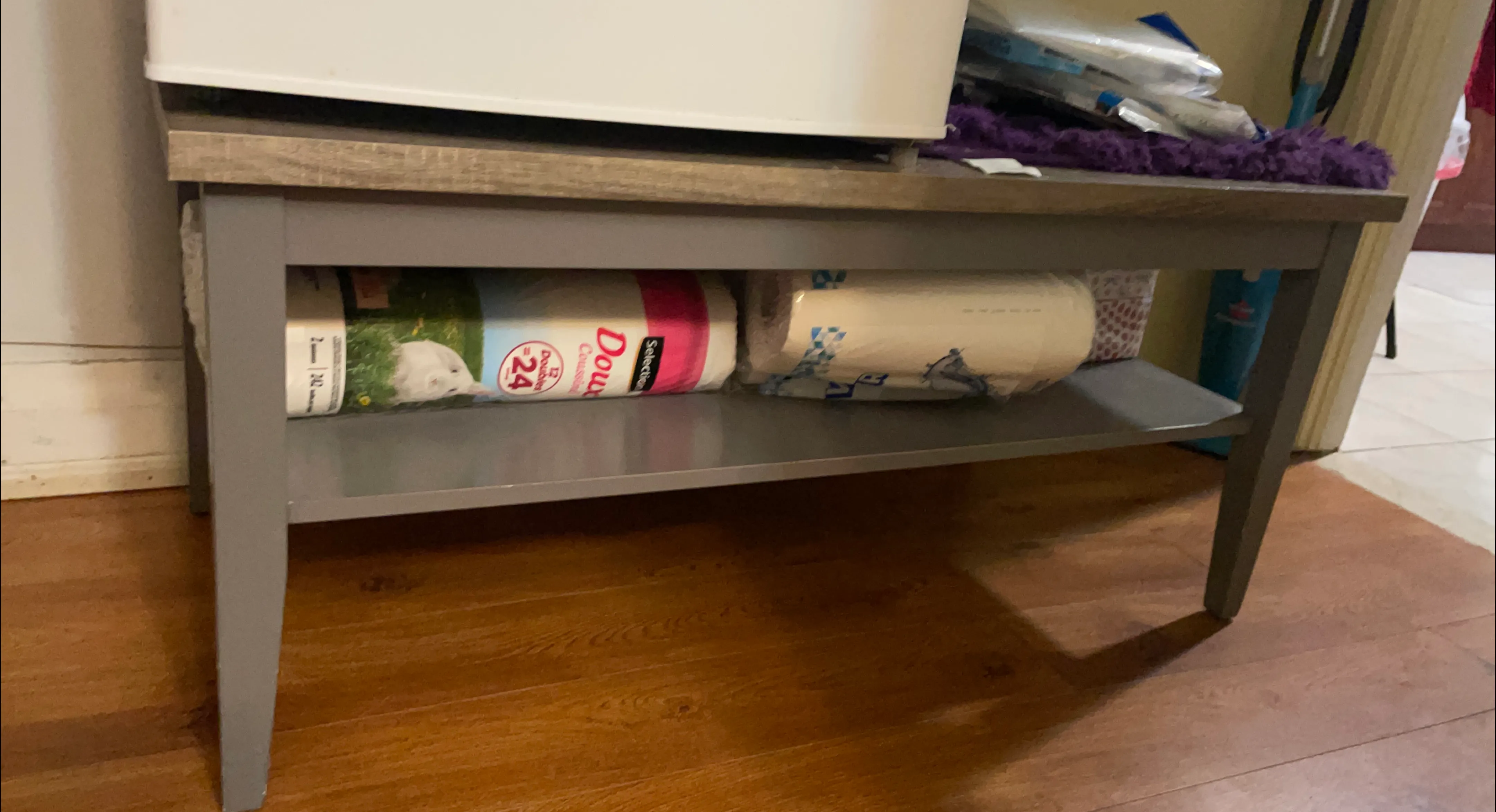Selling a grey entryway bench with a shelf. It's in great condition and perfect for storing shoes or other items. The top is a nice wood-look finish. It would look great in any home!