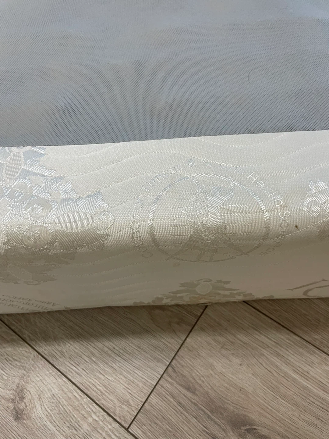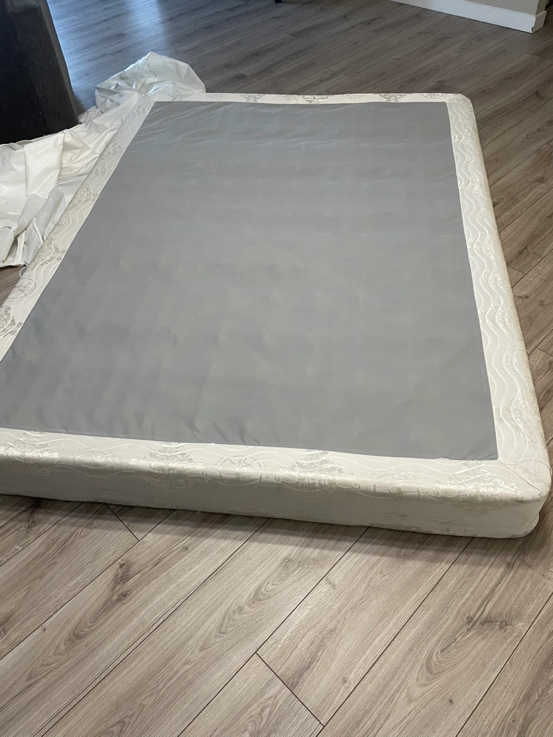 Selling a queen size box spring in great condition! The box spring has a white floral pattern around the edges and a grey top surface. It's about 9 inches thick.