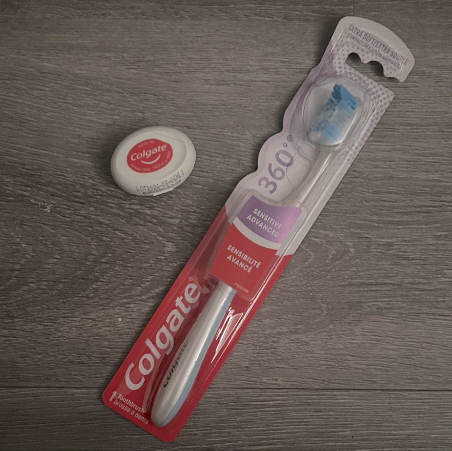 Selling a brand new Colgate 360° Sensitive Advanced toothbrush and Colgate floss! The toothbrush is extra soft and has a compact head, perfect for sensitive teeth and gums