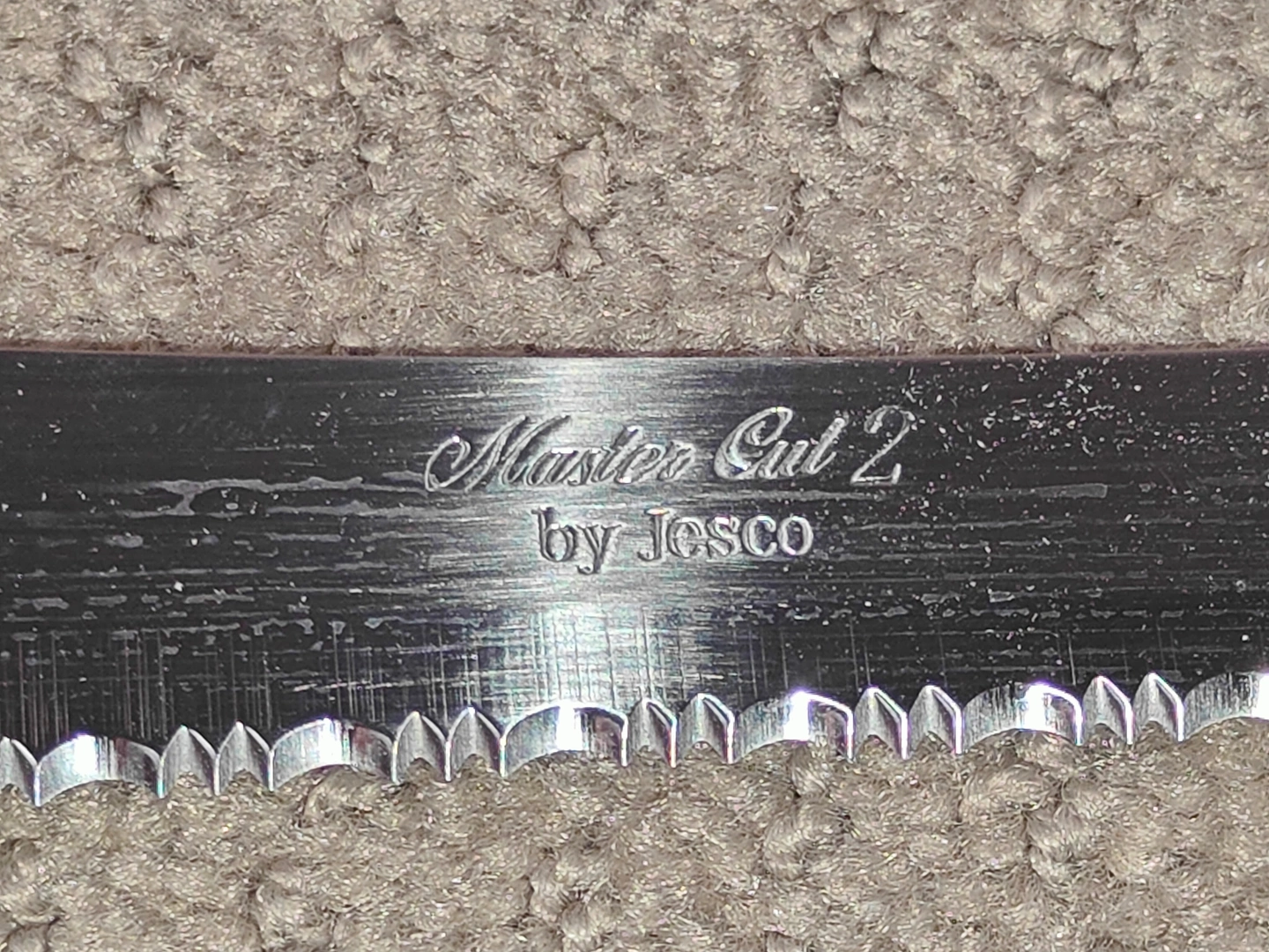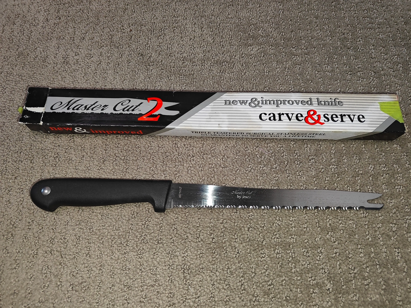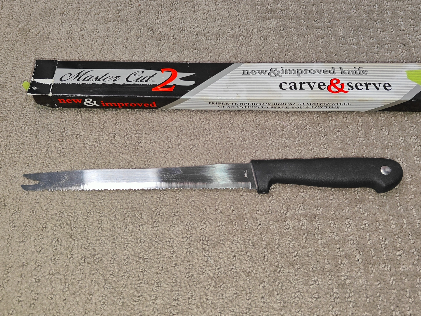 I am selling a Master Cut 2 Carve & Serve 8" Kitchen Knife by Jesco in used, good condition. Get a classic "carve & serve" knife with this Master Cut 2 by Jesco. This knife comes in its original packaging and is in good, used condition. Known for its serrated edge and triple-tempered surgical stainless steel, this is a versatile knife perfect for carving meats, slicing breads, and serving with the unique forked tip. This knife has an 8-inch blade and a total length of 13 inches, making it a great size for your kitchen. The blade is in solid shape with no issues, and the handle is comfortable and secure. Whether you're looking for a reliable carving knife for the holidays, a classic tool to add to your collection, or a sturdy knife for everyday use, this vintage Master Cut 2 is ready to go.