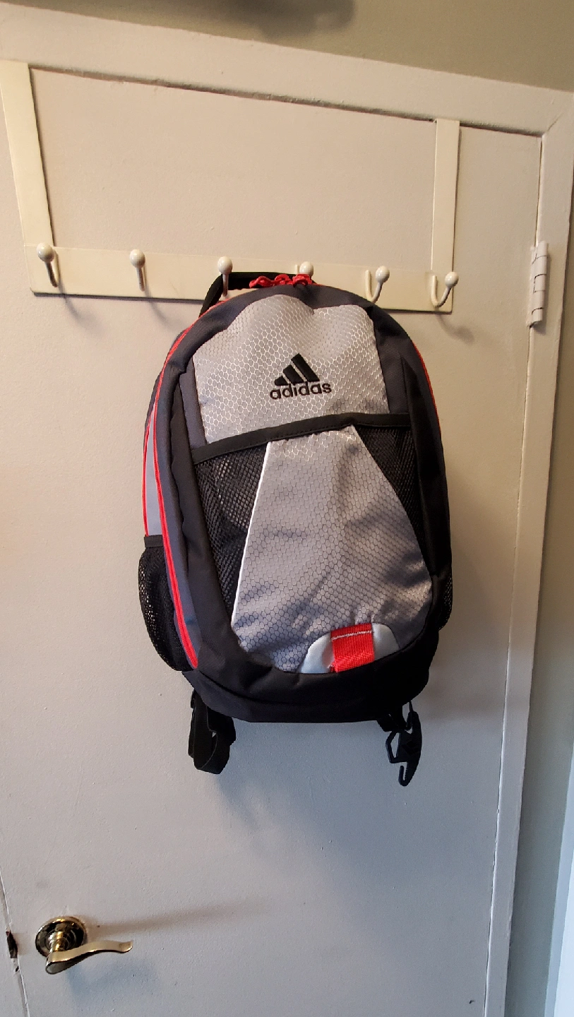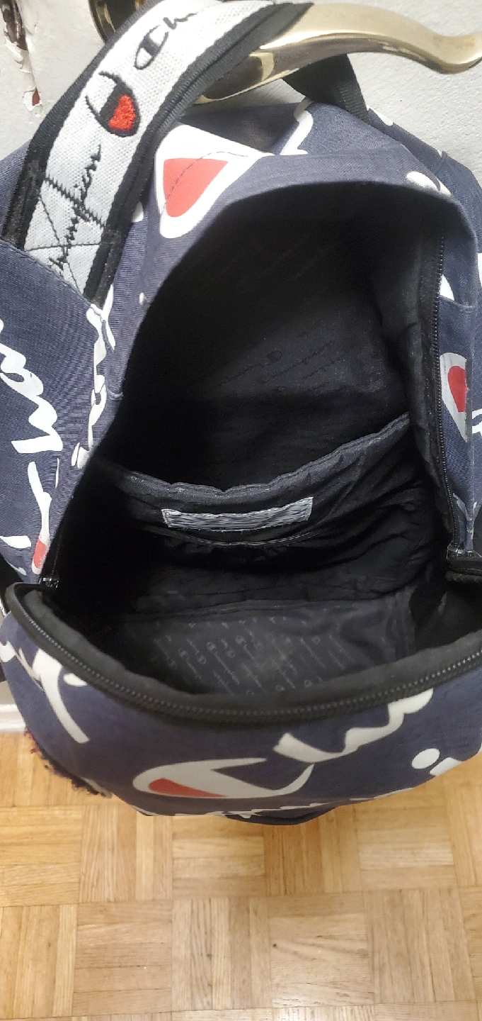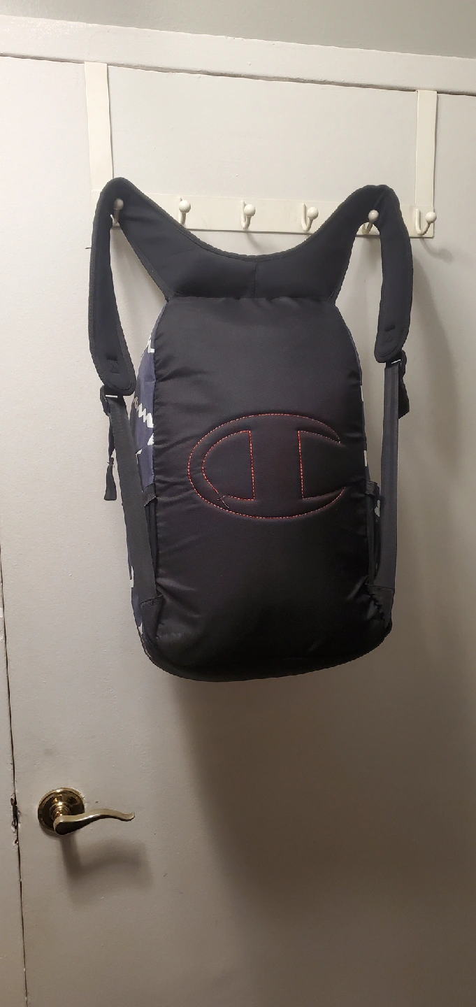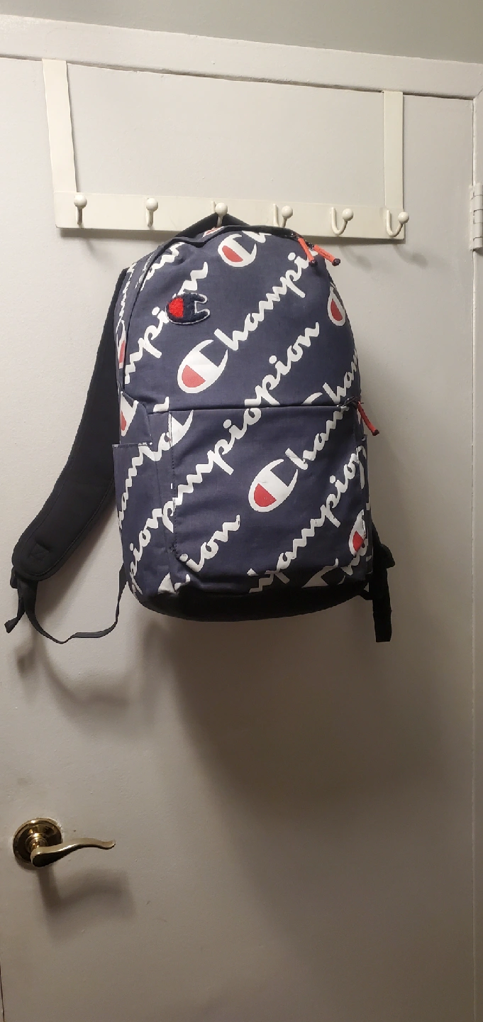 I have backpacks for sale! One is a Champion backpack with a navy blue background and white Champion logos all over. The other is an Adidas backpack in gray and black with red accents. Both are in good condition and ready for a new home.