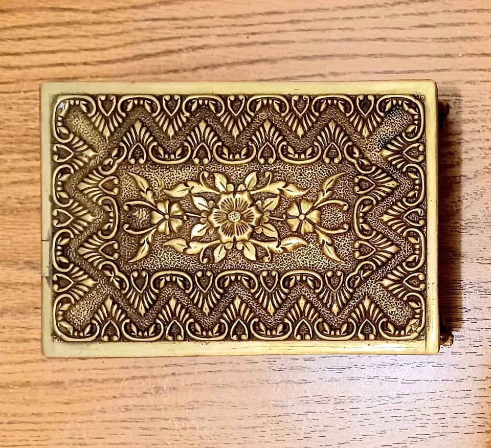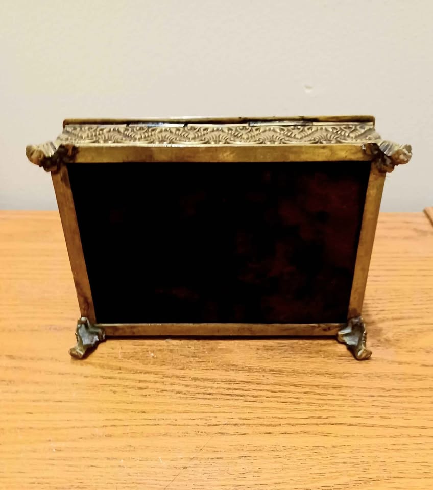 Antique, Very Rare, Intricate Design, Heavy, Hinged Embossed Brass Jewelry Box, Keepsake Box. Floral & Ornate Patterns. Inside: Wooden Claded. Bottom: Amaranth. For Storing & Organizing Valuable Jewelry. Detailed Craftsmanship. Holds sentimental value and Decorative Piece.