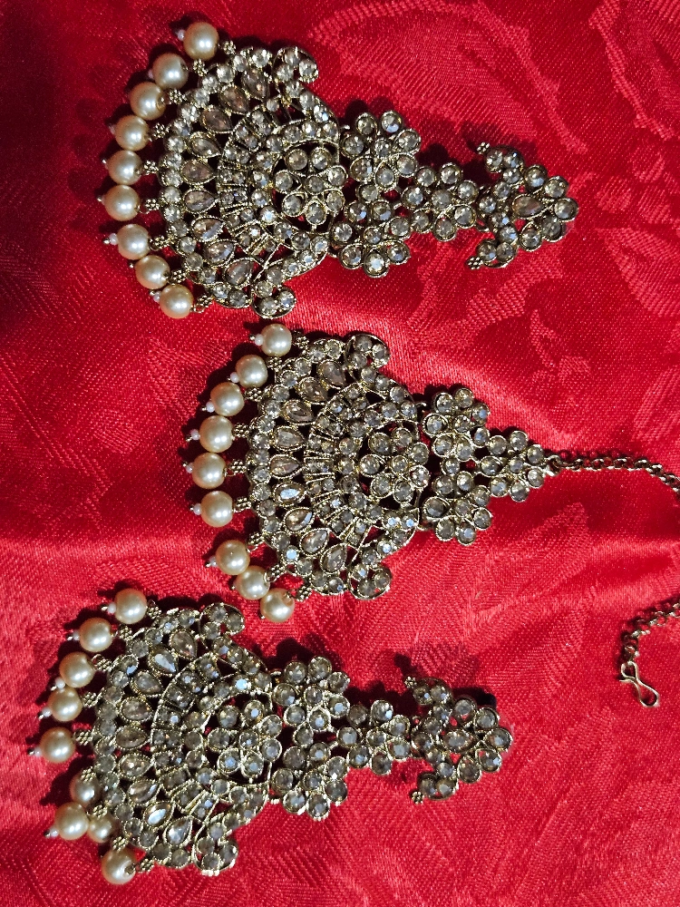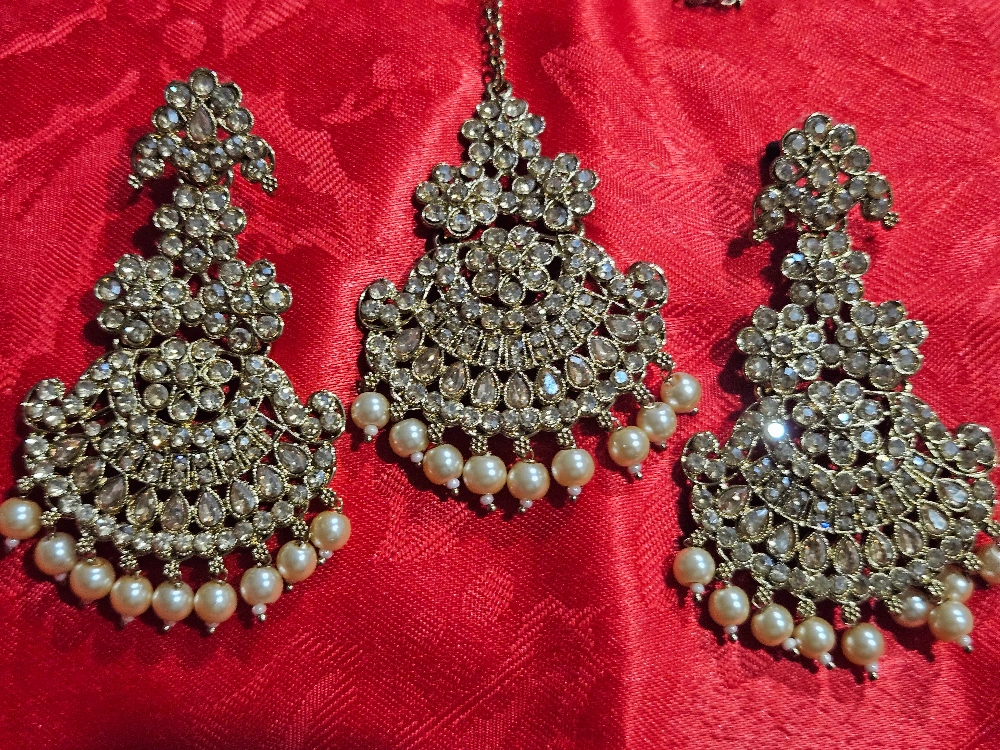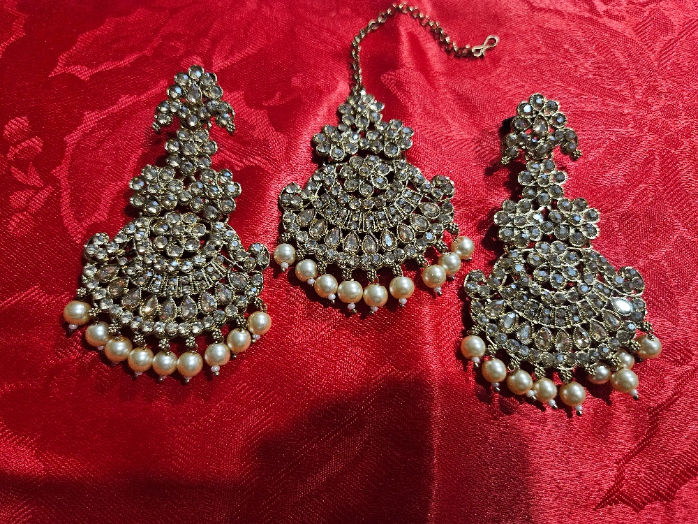 Selling a beautiful set of Indian jewelry, including earrings and a tikka. The set features intricate designs with faux pearls and sparkling stones. Perfect for adding a touch of elegance to any outfit!