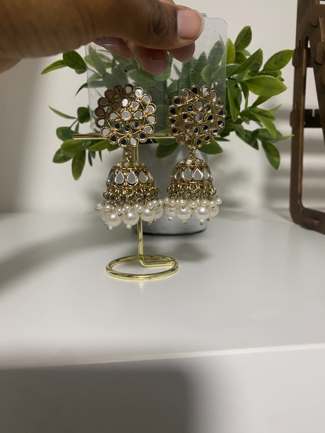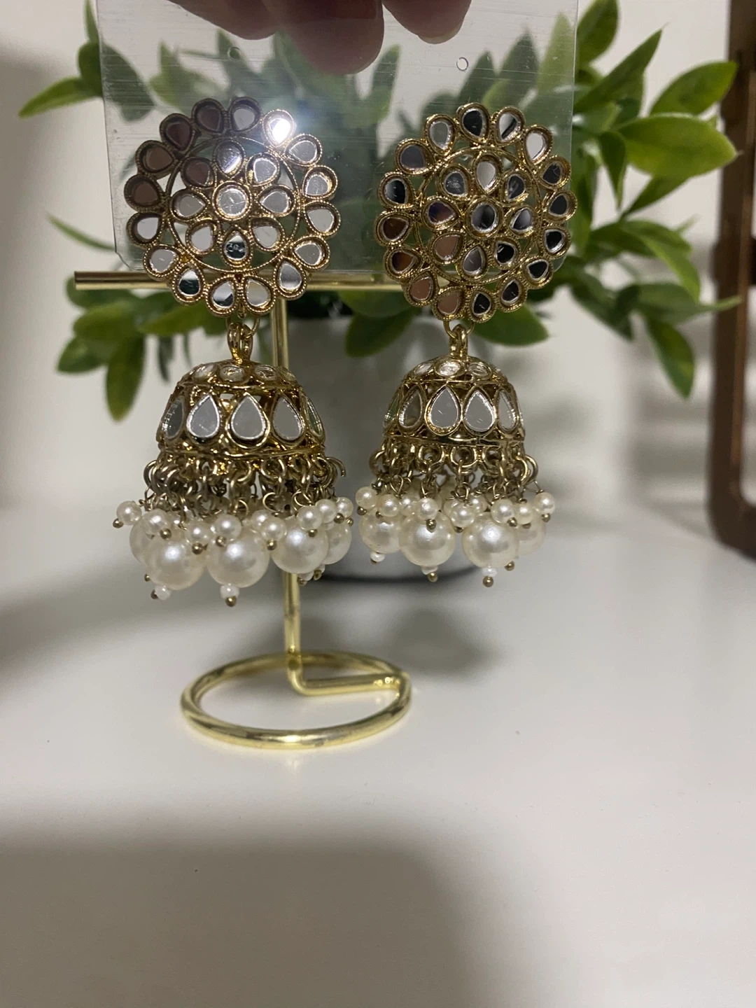 Beautiful jhumka earrings featuring a gold-tone finish and lovely pearl accents. These earrings are in great condition and ready to add a touch of elegance to your outfit!