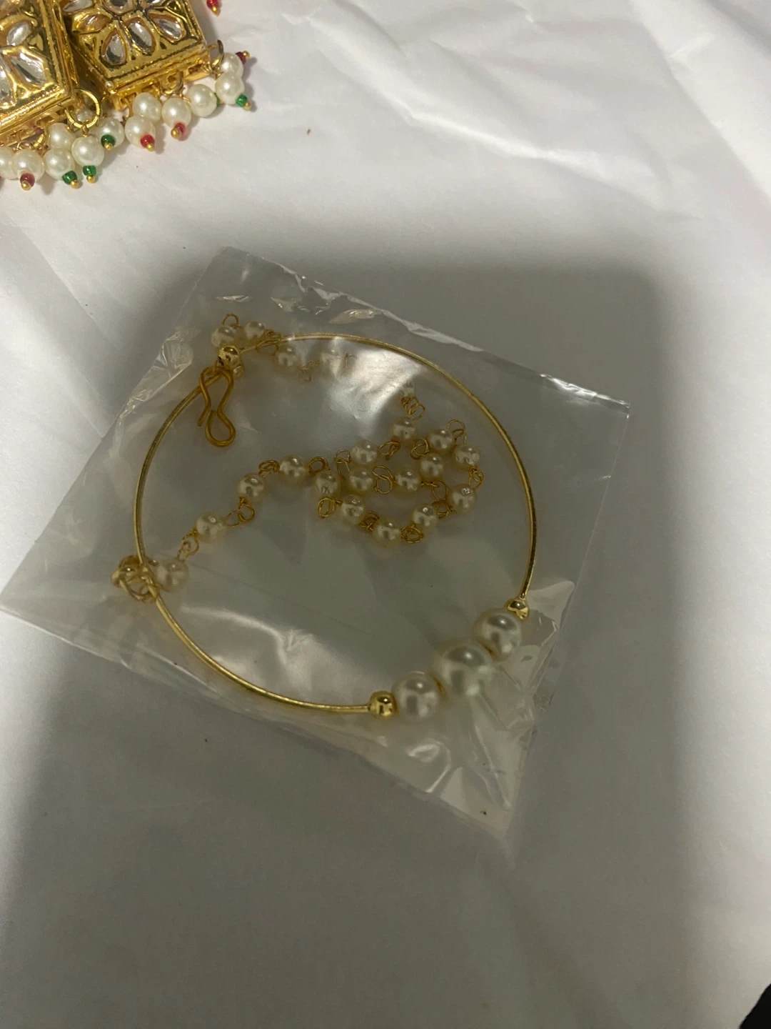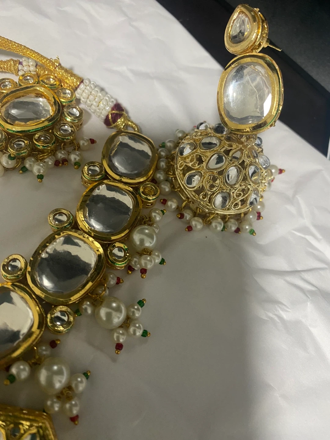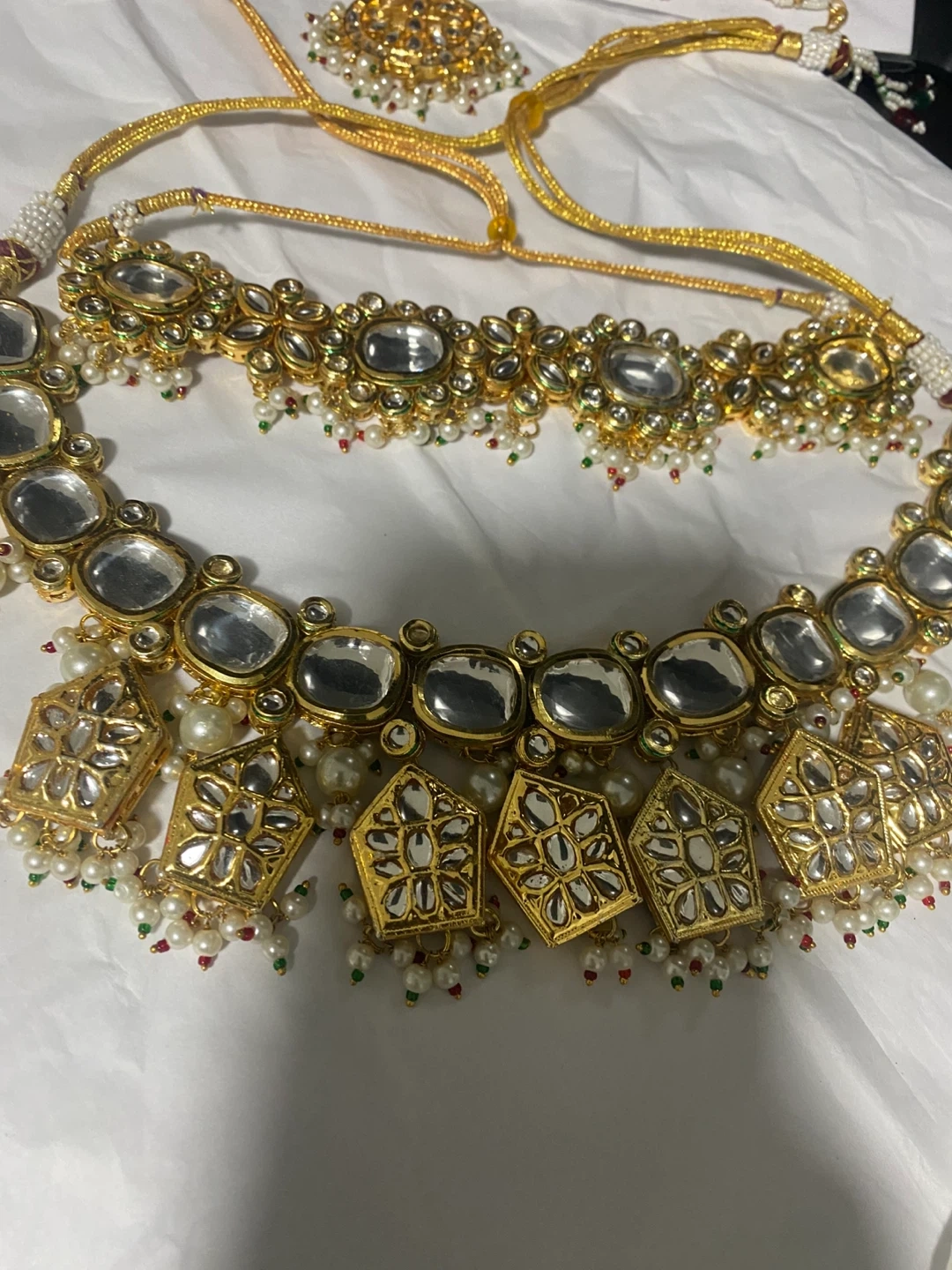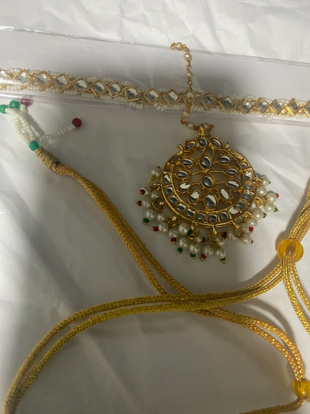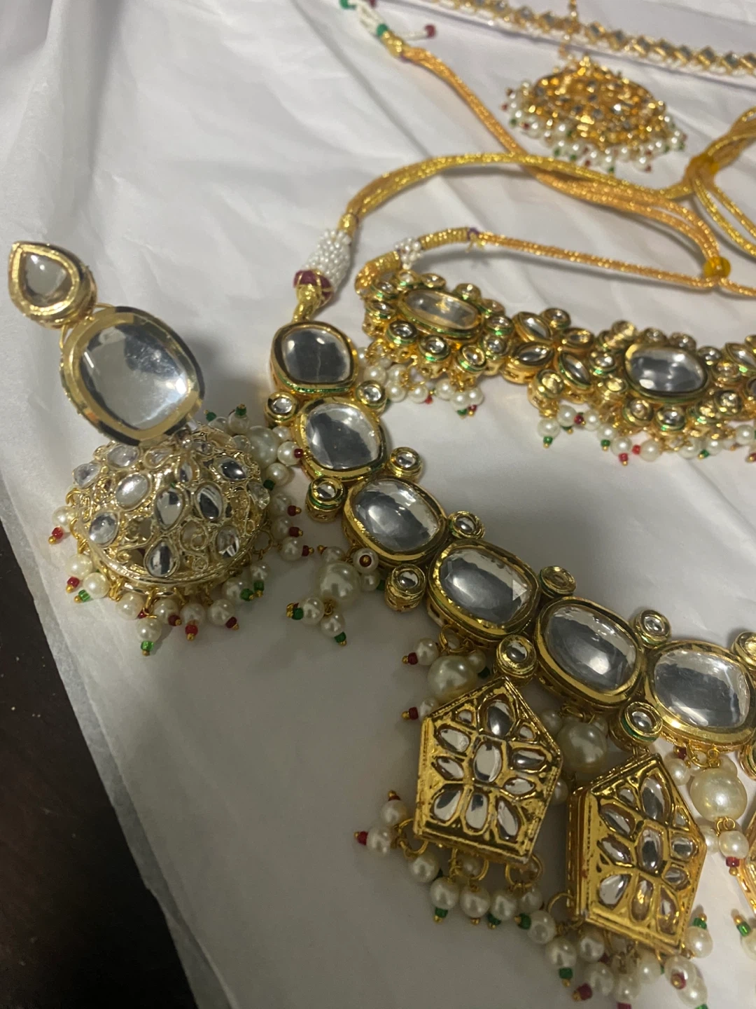 Beautiful Kundan jewellery set including a necklace, earrings, tikka, and nath. The set features intricate detailing with pearls and stones, perfect for weddings or special occasions!
