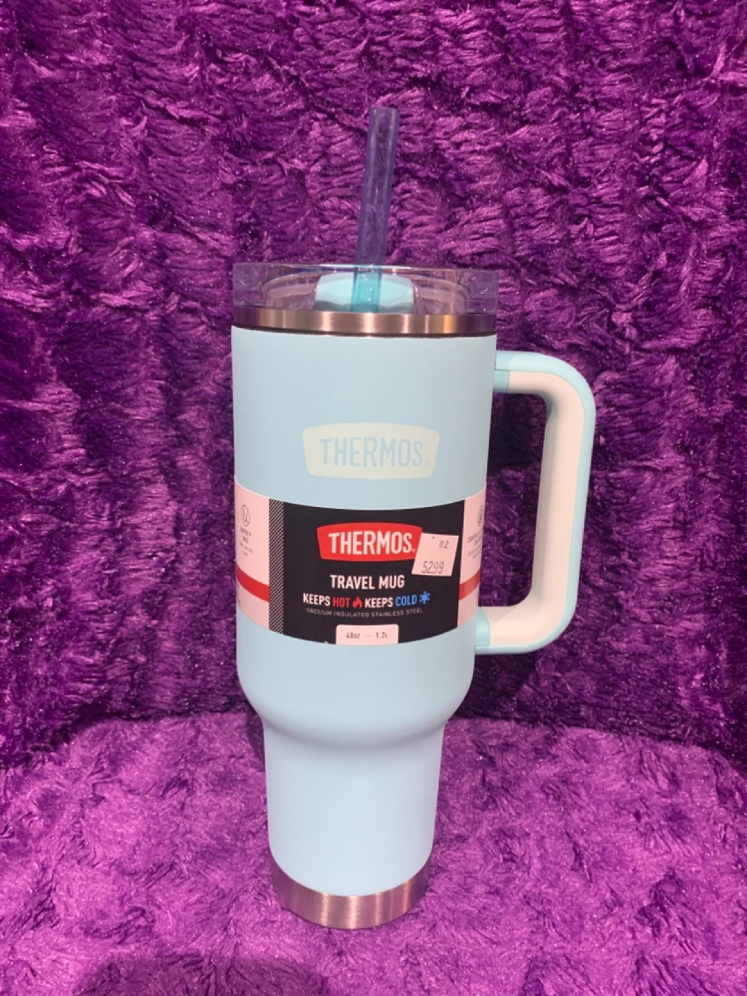 1000+Selling a Thermos travel mug! It's a light blue colour and keeps both hot and cold drinks at the right temperature. It's vacuum insulated and made of stainless steel. It's a 40oz (1.2L) mug. Originally bought for $52.99