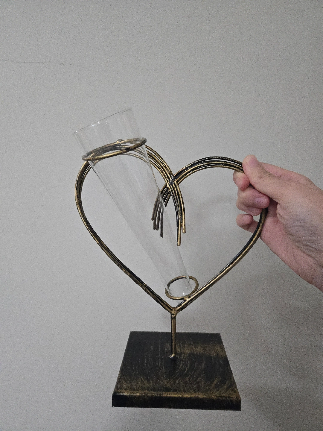 Selling a heart-shaped vase! It features a clear glass tube held within a gold and black metal heart frame. It's perfect for adding a touch of love to any room.