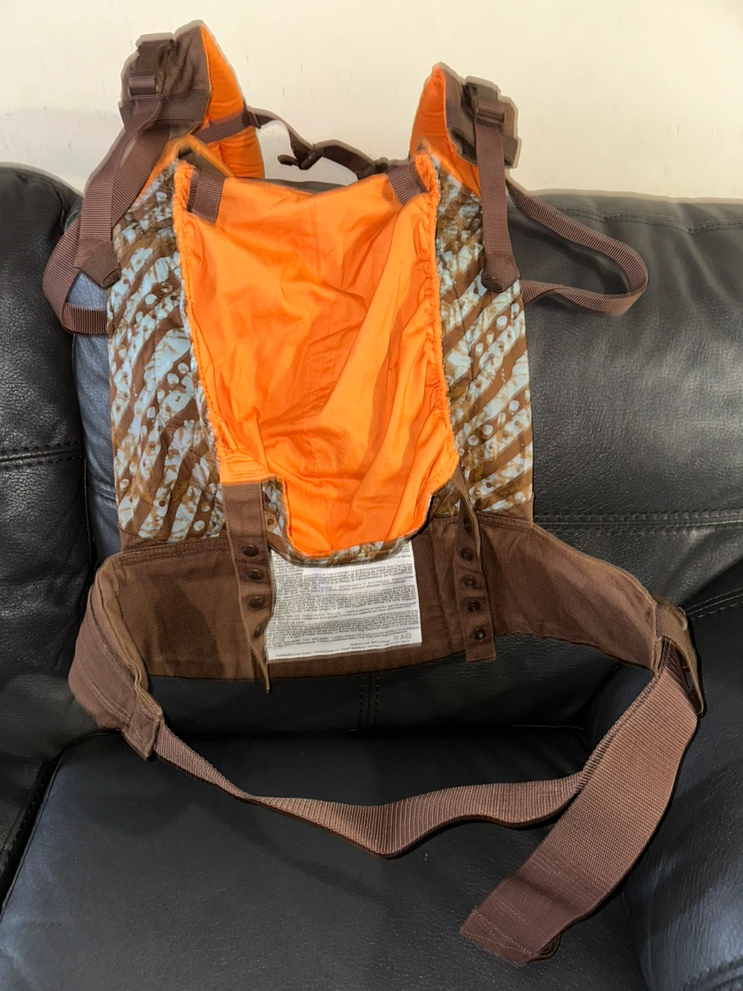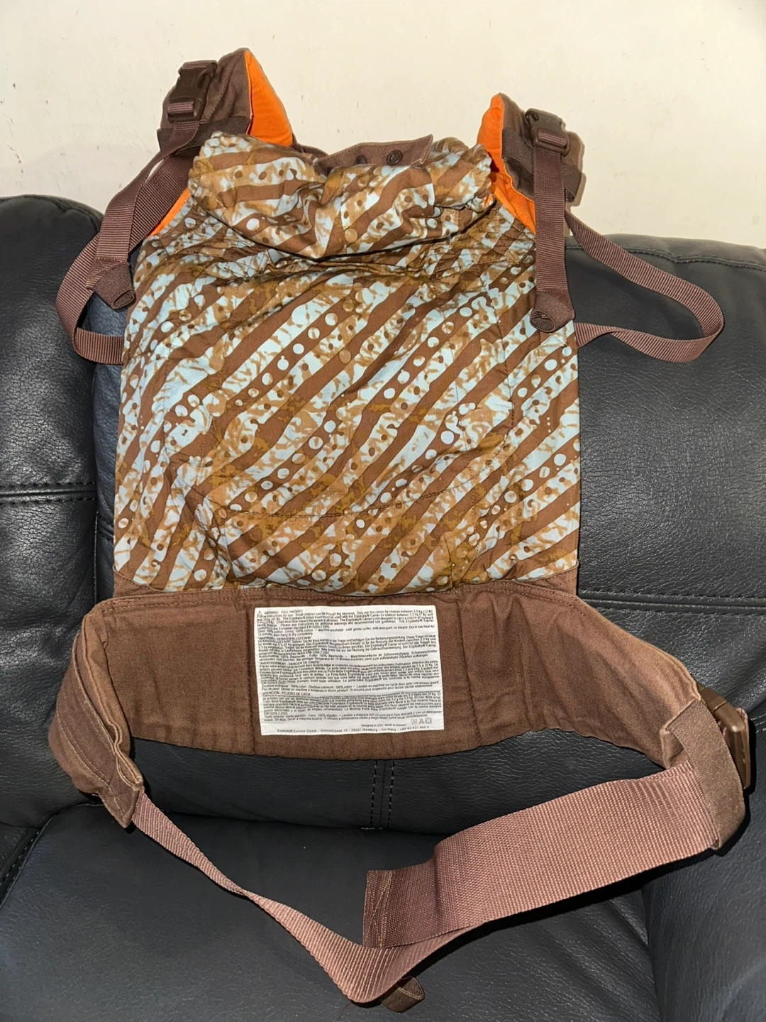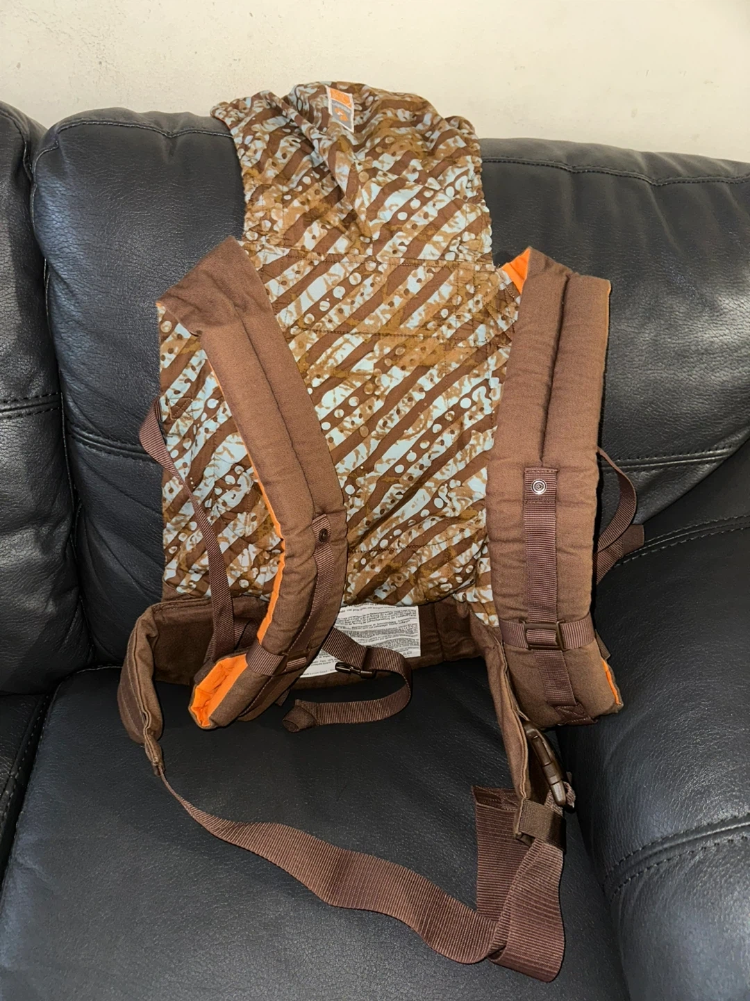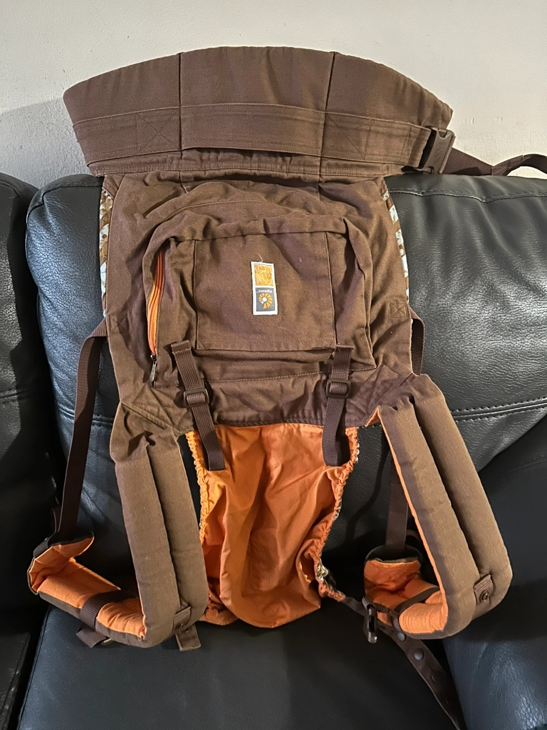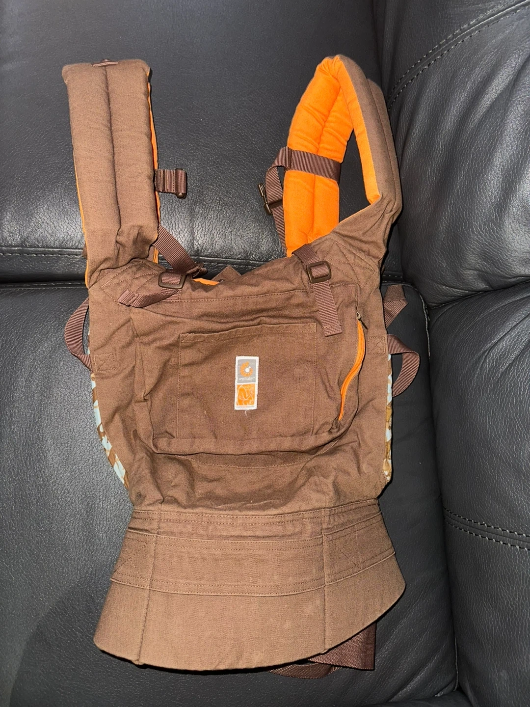 Gently used Ergobaby carrier in a lovely brown and orange colour scheme! Perfect for keeping your little one close and comfortable while you're on the go. It's in great used condition.