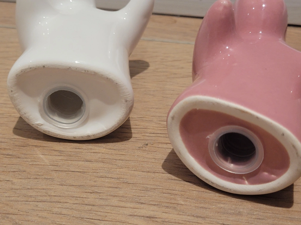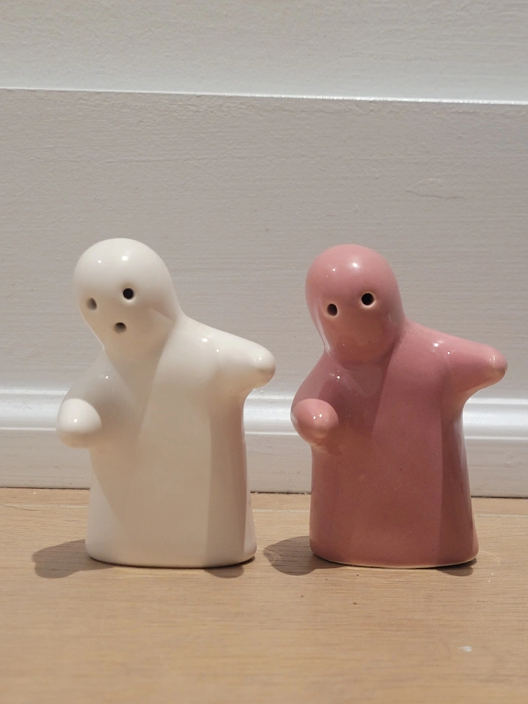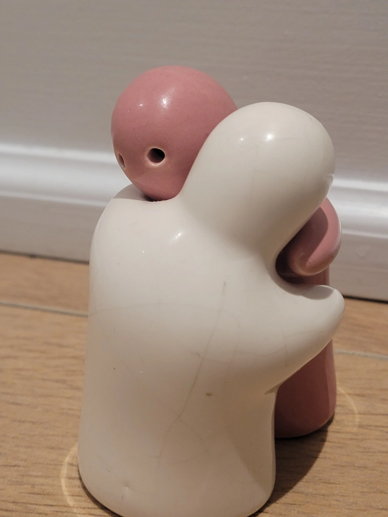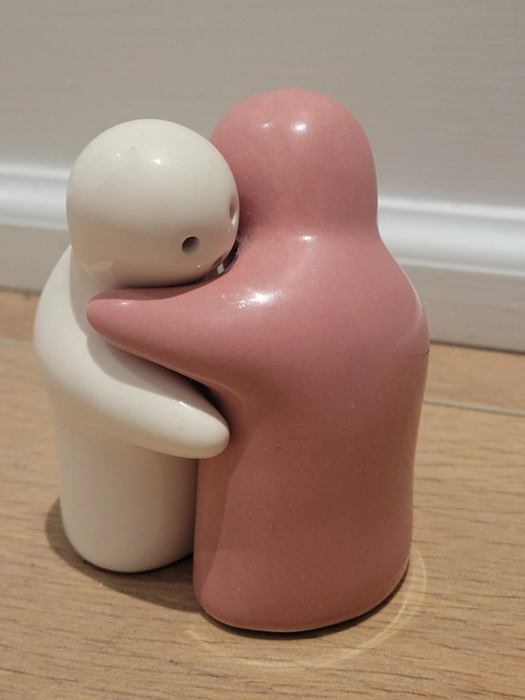 These adorable hugging salt and pepper shakers are sure to bring a smile to your face! The set includes one white shaker and one pink shaker, both made of ceramic.