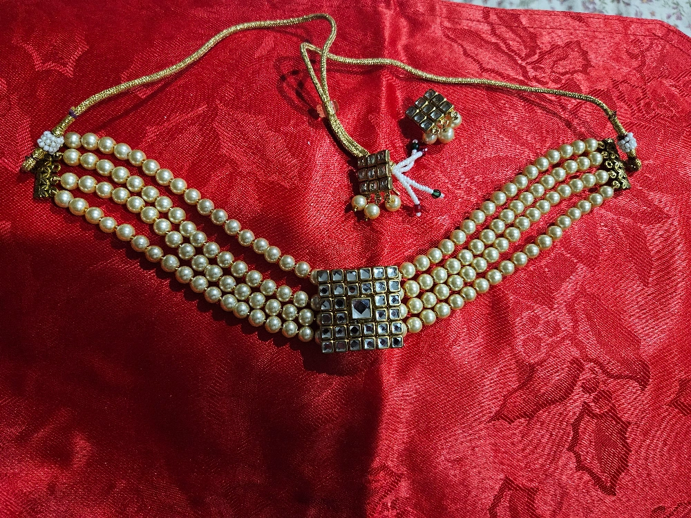 Selling a beautiful pearl necklace with matching earrings! This set features a multi-strand pearl necklace with a square pendant and matching earrings. Perfect for adding a touch of elegance to any outfit