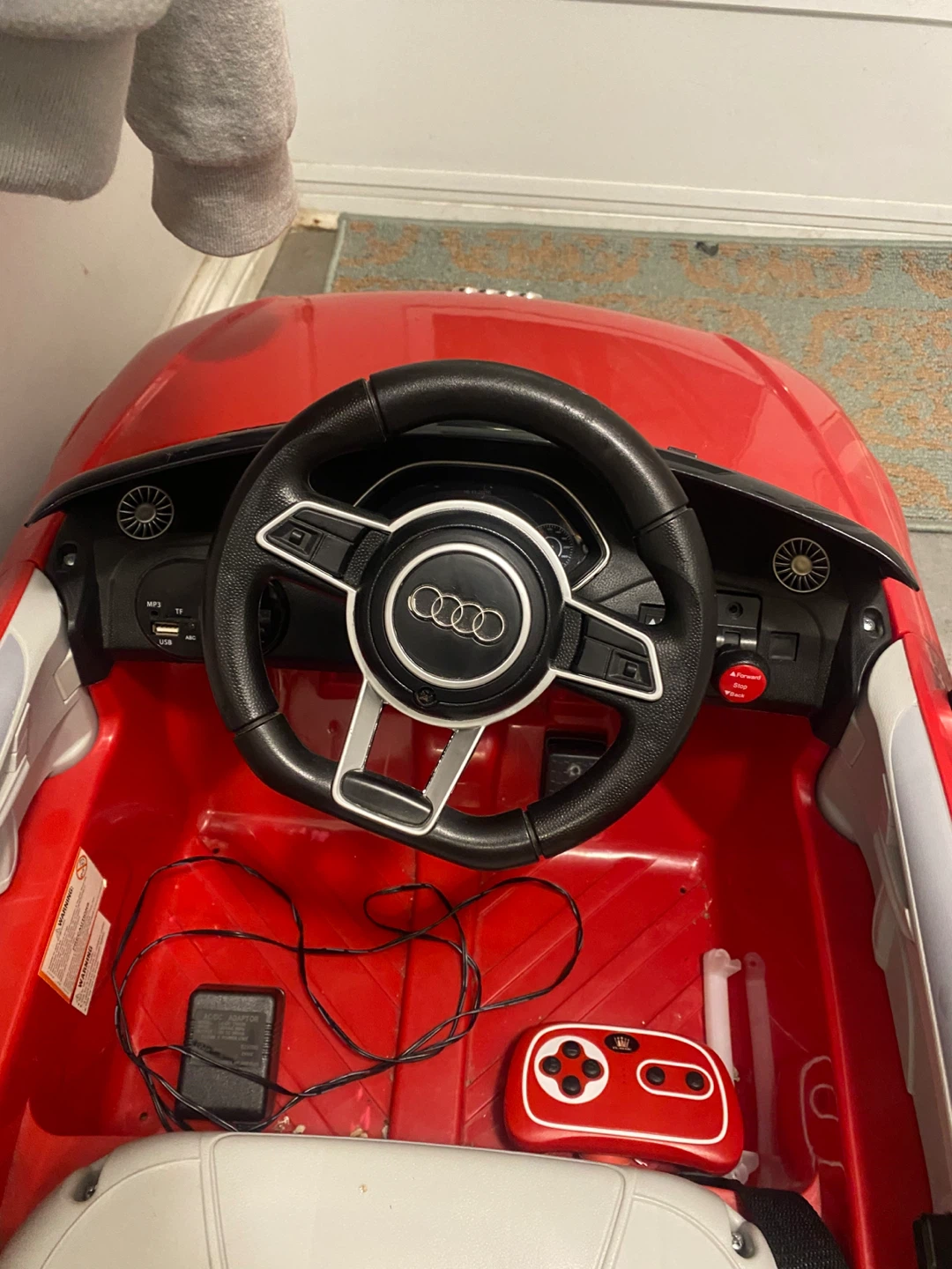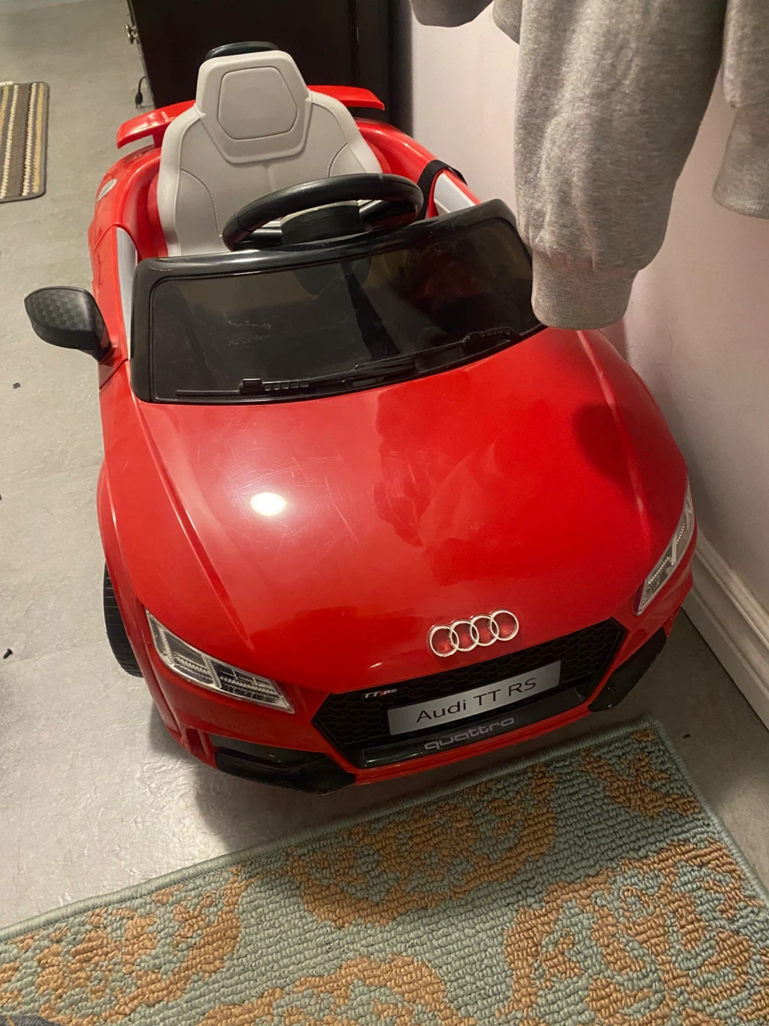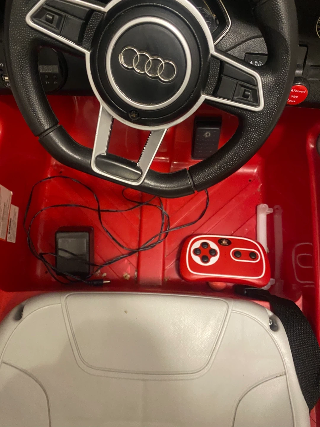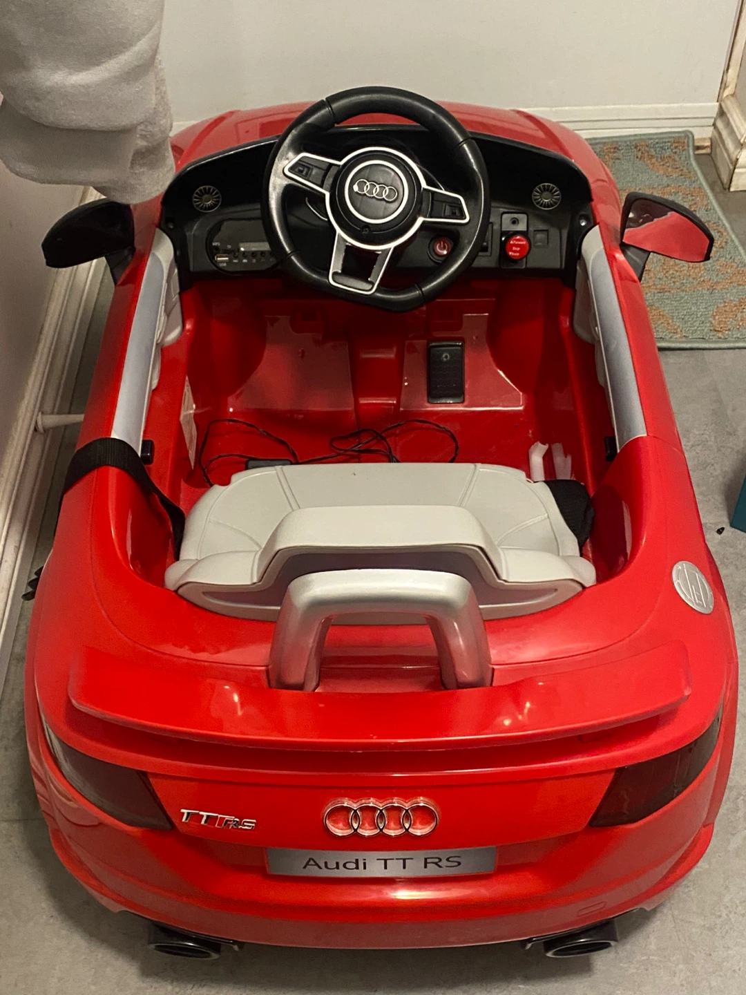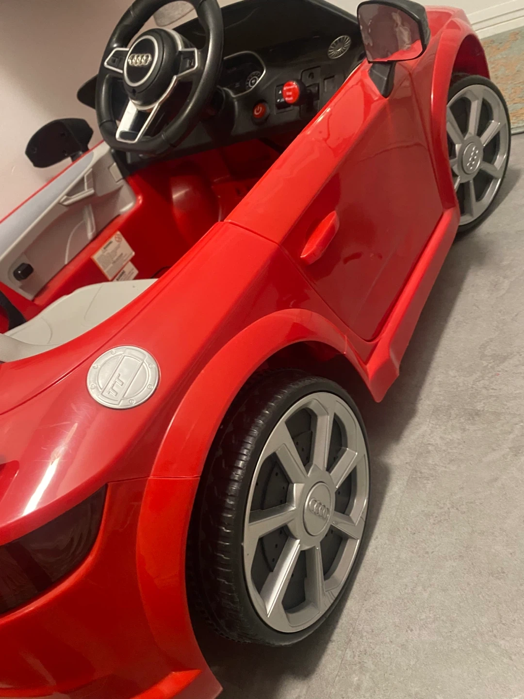 Selling a red Audi TT RS ride-on car for kids! It comes with a remote control, so you can help guide your little one as they cruise around. It also includes a charger. Battery needs to change.