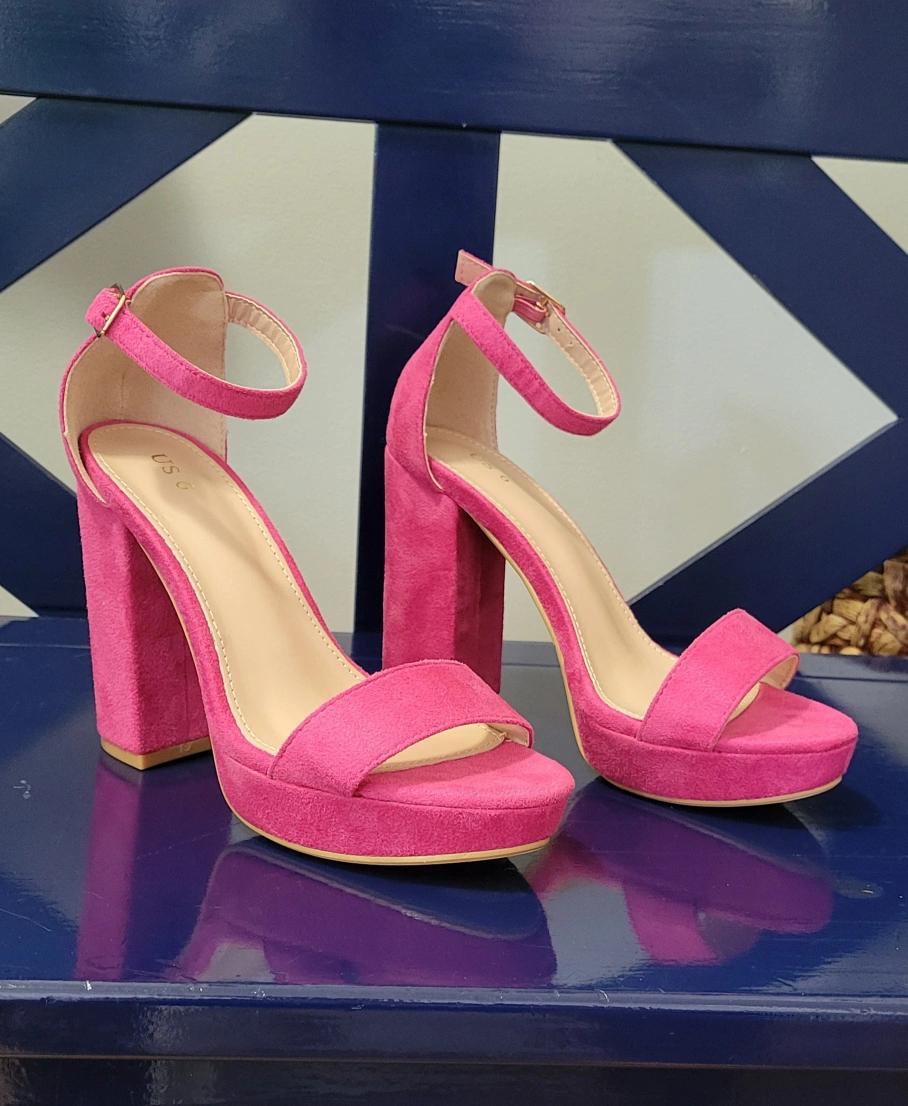 Brand new, never-worn pair of fun and vibrant pink suede platform heels! They are a size 6. The heel height is approximately 4.5 inches with a 1.25 inch platform. They have a buckle at the ankle closure and a TPR rubber sole. The outer material is faux suede. These heels are perfect for adding a pop of colour to any outfit!