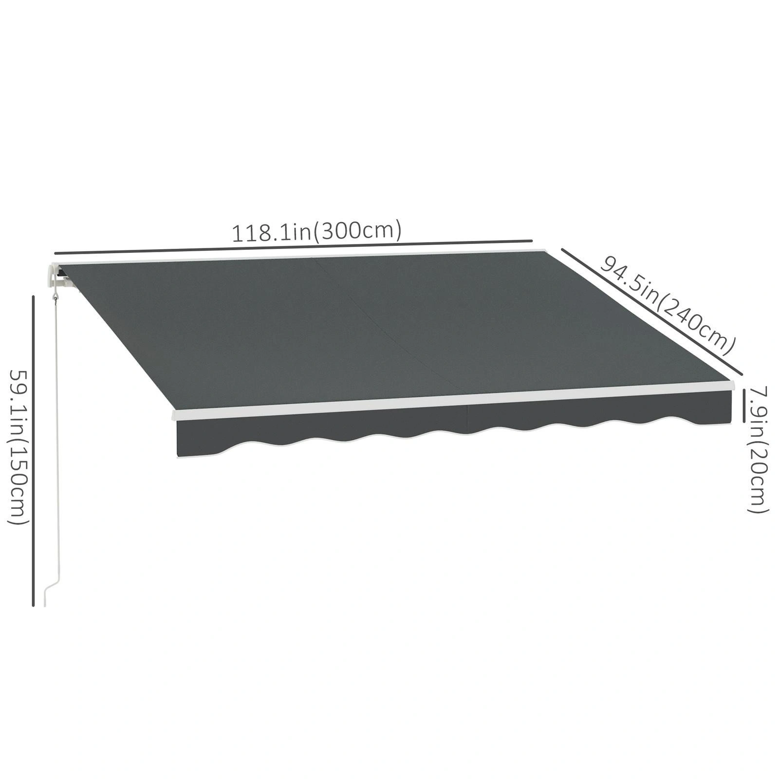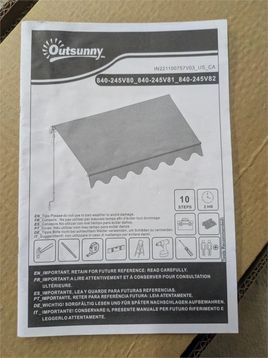 BRAND NEW, Only opened to check. This electric retractable awning offers controllable shade for windows and doors. It can be operated via remote control or manually with a hand crank. Made from 270g PU-coated polyester, it protects against UV rays and helps reduce indoor heat. The adjustable canopy allows for a 4-30 angle for optimal shade. Constructed with a durable aluminum and steel frame, it ensures stability and longevity. The shaded area measures 118.1" L x 98.4" W. Proper installation requires a wall height of at least 9.2'/280cm. Overall Dimensions: 118.1" L x 98.4" W x 59" H Item Weight: 47.3 lbs Condition: Brand New (Only Opened to check)