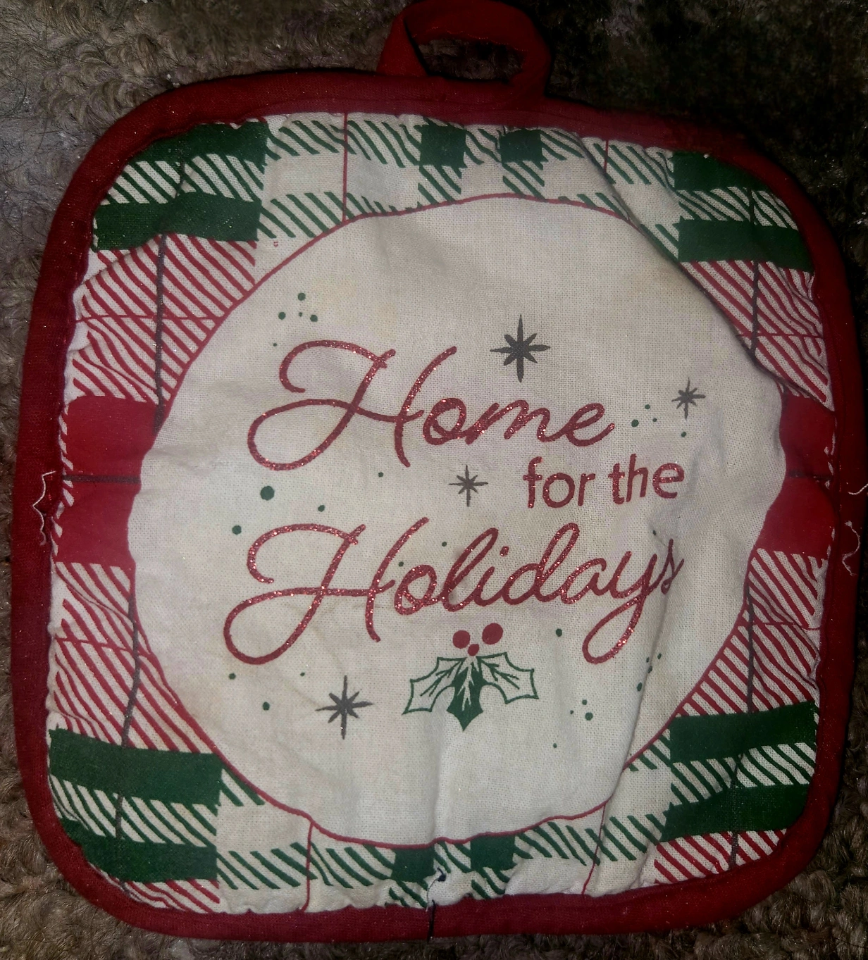 Cozy up your kitchen with this adorable 'Home for the Holidays' potholder! It's perfect for adding a touch of festive cheer while you bake your favourite holiday treats. Made of 100% cotton, it's both cute and practical for all your cooking needs. Pick up only.