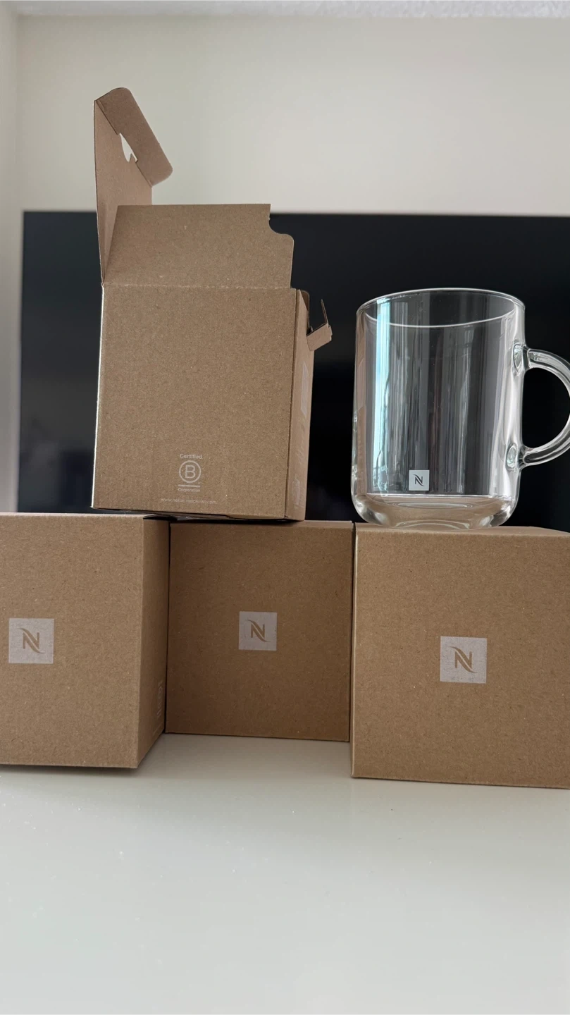 As a present, it comes with 4 original Nespresso glass cups. The cups were never used.