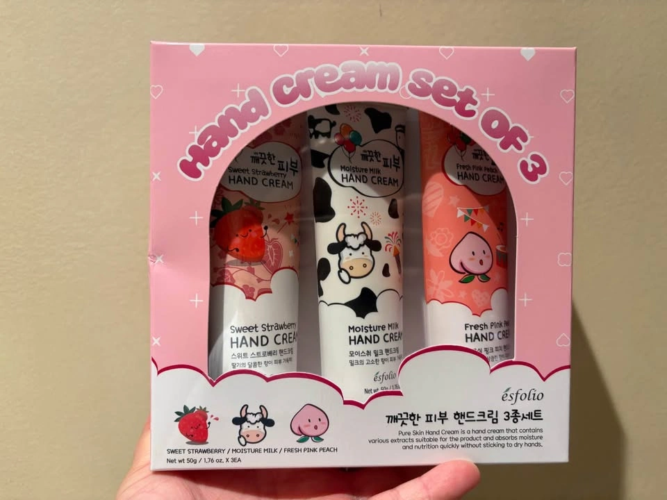 New, never used hand cream and body lotion. Peach hand cream - $5 Put a little in your hand and fully spread to the whole palm and back of the hands. Use after washing hands. Great skin care and have a great peach scent! Hand cream set of 3 - $8 Great for gifts and self use with three different scents! Easy to carry. Strawberries, milk and peach! Honey milk and cherry blossom Handcream - $10 Popular scents, great moisturize! Strawberry milk body lotion - $8 Strawberry scent and smells awesome when you're at an event or friends gathering! All prices based on the original price when I bought them. Rounded up price.