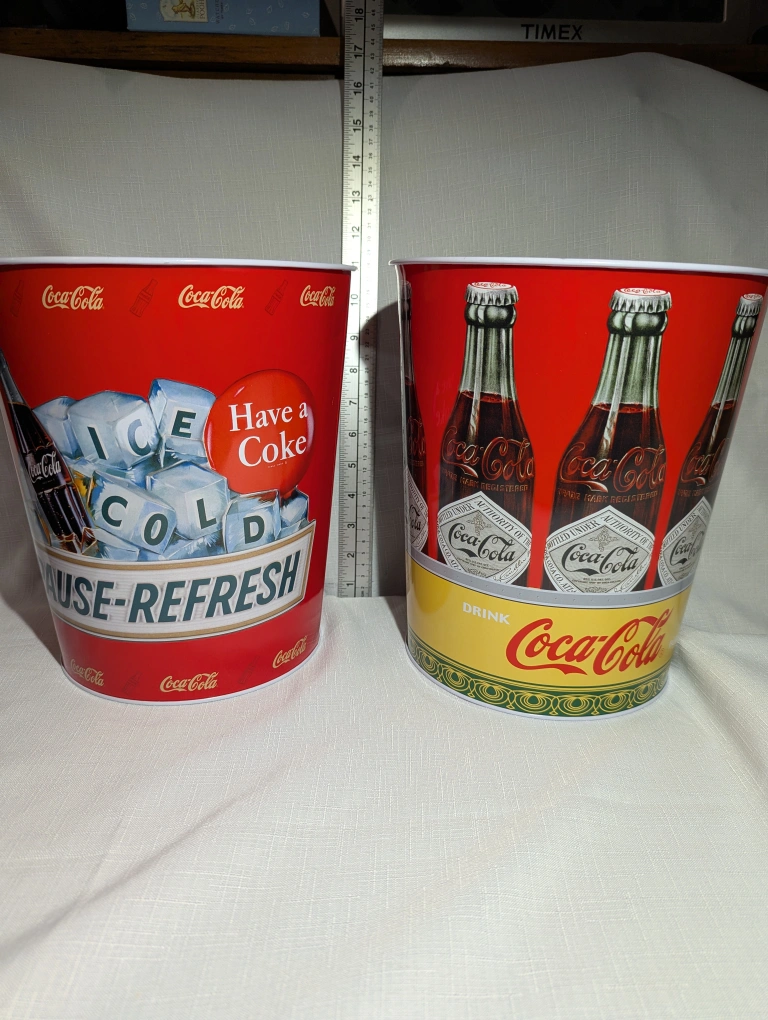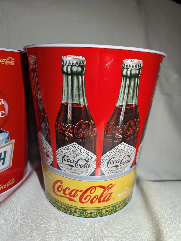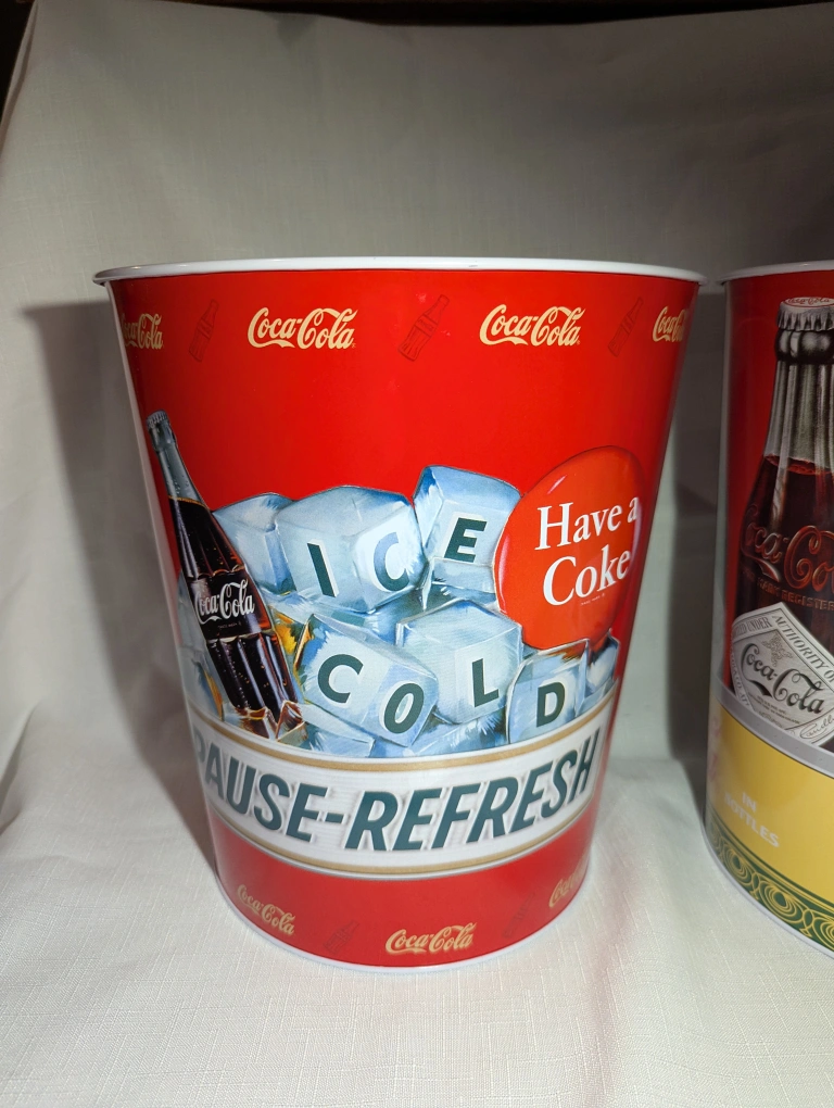 They feature classic Coca Cola designs with great detail. Use for storage or decoration or as a garbage can.