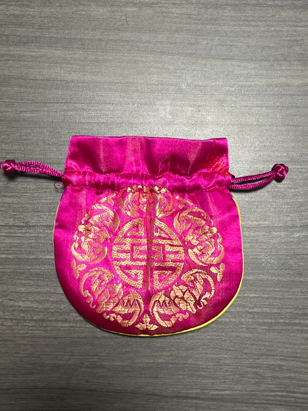 A cute little pouch with a drawstring. It's a vibrant pink with gold detailing.