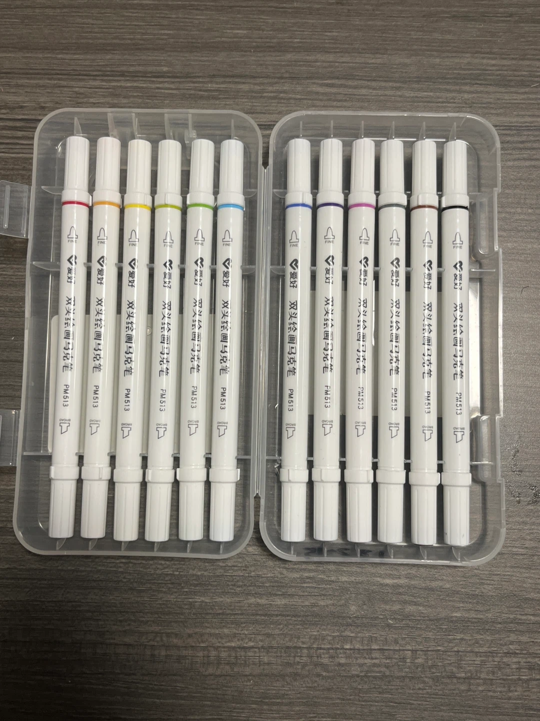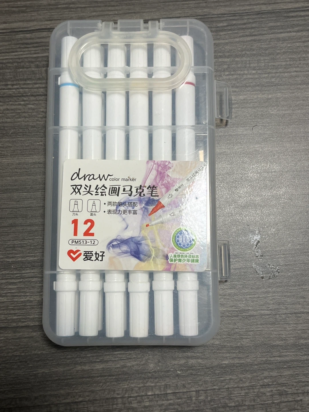 Selling a set of Draw colour markers! This is a 12-pack of dual-tip markers, perfect for drawing and colouring. The markers come in a clear plastic case for easy storage and organization.