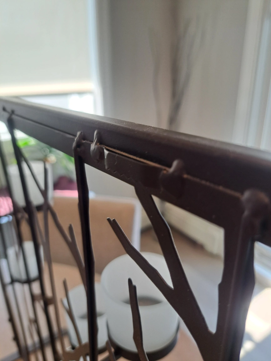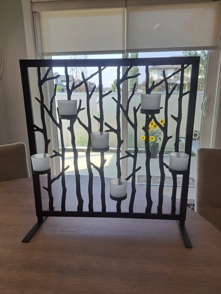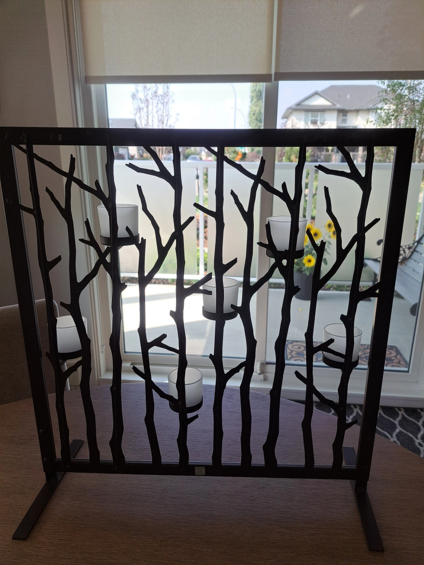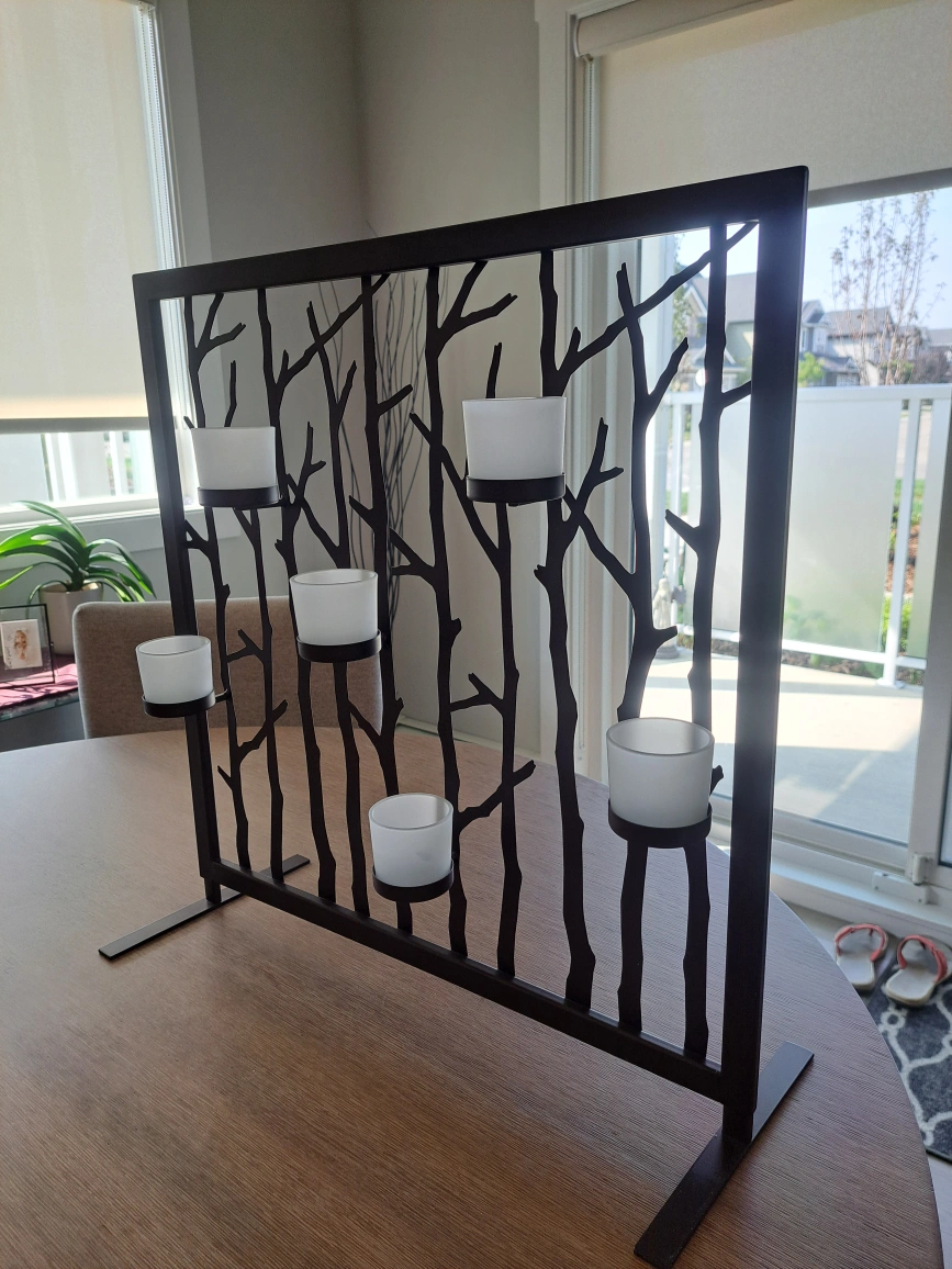 Selling a Partylite metal candle holder with a tree branch design. It holds six frosted glass votive candle holders. It would be a great floor stand or wall mount.