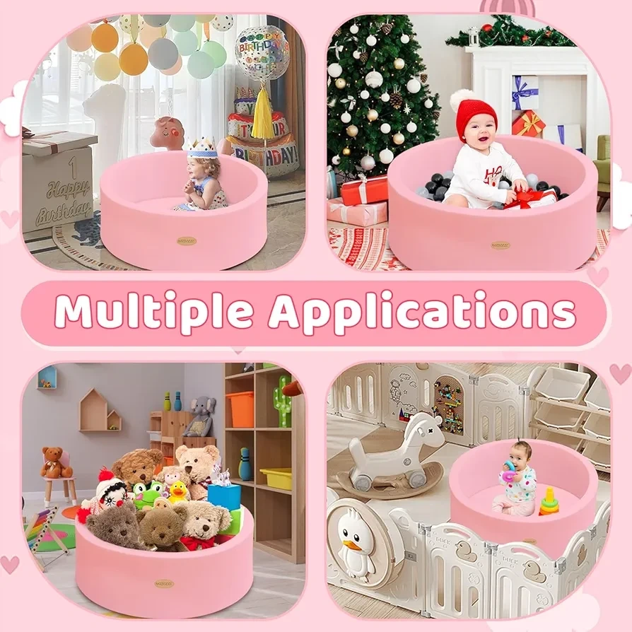 Playpen This pink foam ball pit is perfect for a kids' play area! It has a soft cloth surface that's breathable and skin-friendly. The zipper design makes it easy to disassemble and clean. - Memory foam provides good resilience - Wall thickness is 1.97 inches for strong anti-collision - Dimensions: 35.4 inches (90cm) diameter, 11.8 inches (30cm) height Note: Balls not included