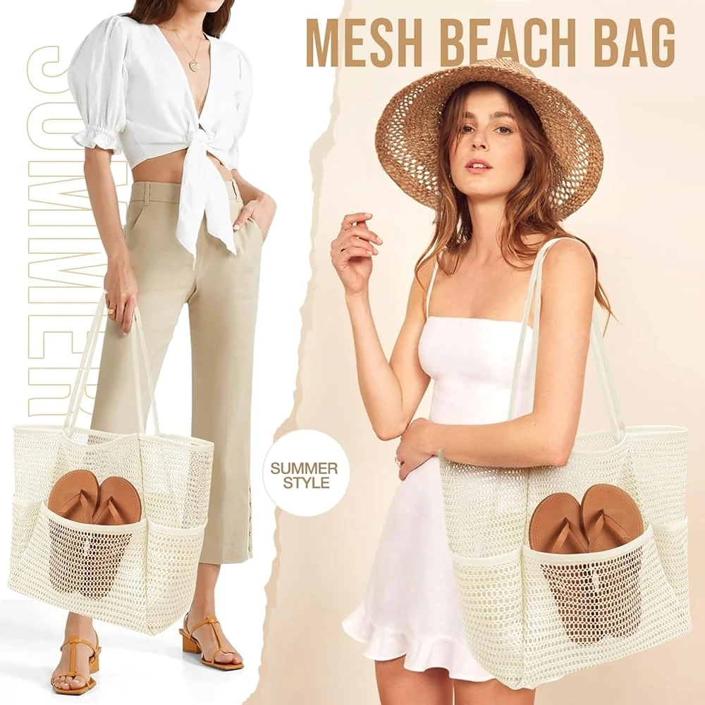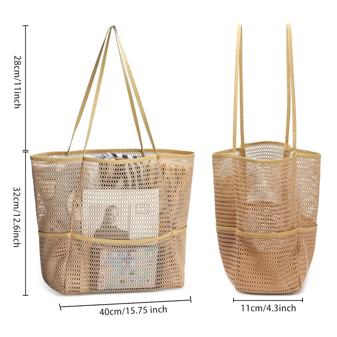 Get ready for summer with this stylish mesh beach bag! It's perfect for carrying all your essentials to the beach or pool. The bag is designed with comfortable shoulder straps and reinforced mesh for durability. It also features an interior pocket with a zipper to keep your valuables safe and secure. The large capacity inside can hold over 25 pounds, but the bag itself only weighs 0.6 lbs, making it easy to fold and pack into your carry-on luggage