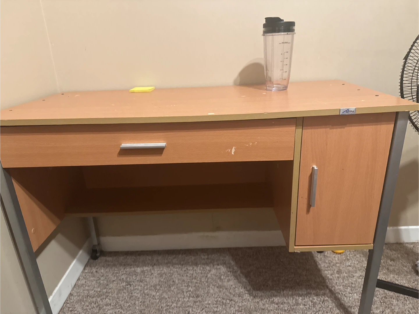 Selling an Alma desk that features a drawer and a cabinet for storage. It's in used condition, with some visible wear. Perfect for a home office or study space!