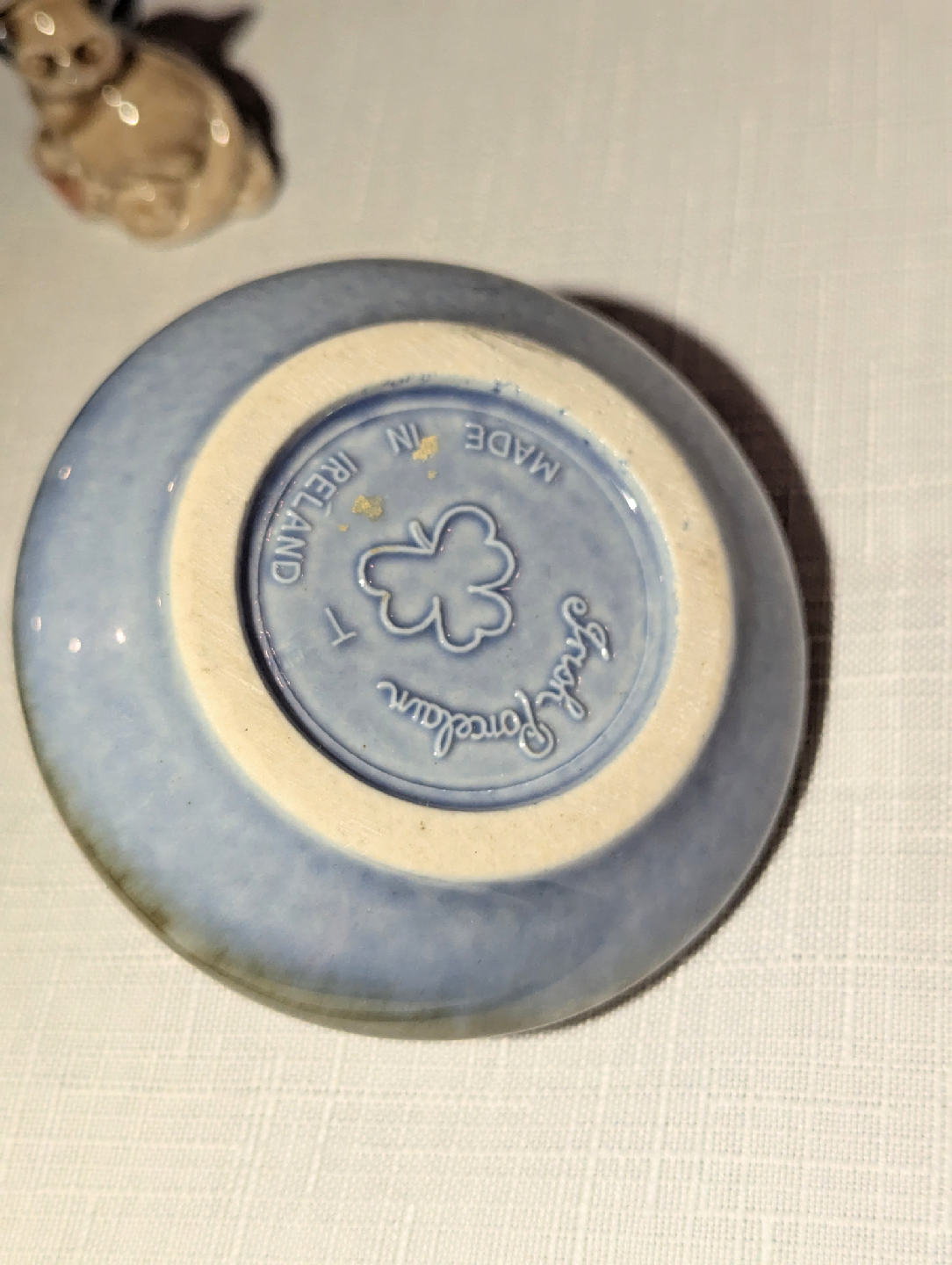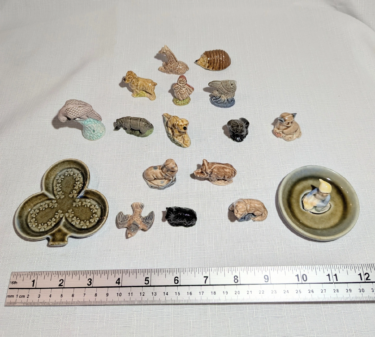 Selling a collection of Wade Whimsies figurines and trinket holder. These charming little figures are perfect for collectors or anyone who appreciates miniature art. They are in great condition and ready to find a new home! The trinket holder on the right is supposed to be rare. No chips.