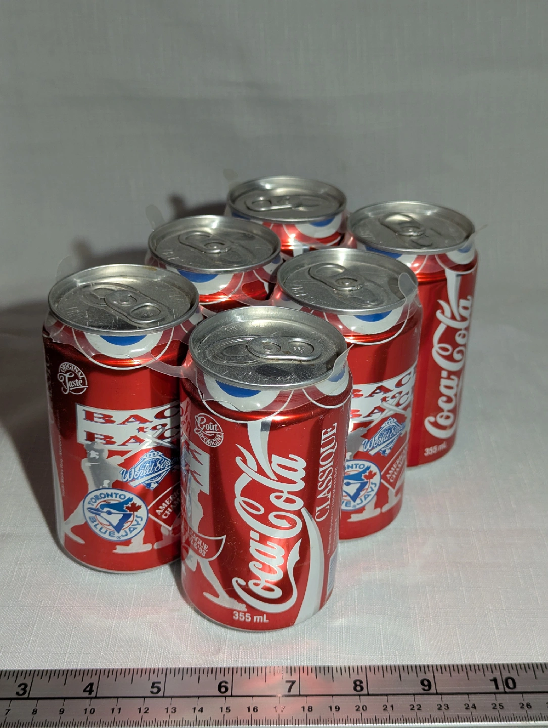 Selling a collectible six-pack of empty Coca Cola Classic cans featuring the Toronto Blue Jays 'Back to Back' World Series wins from 1992 and 1993! These have been emptied as they were notorious for leaking.
