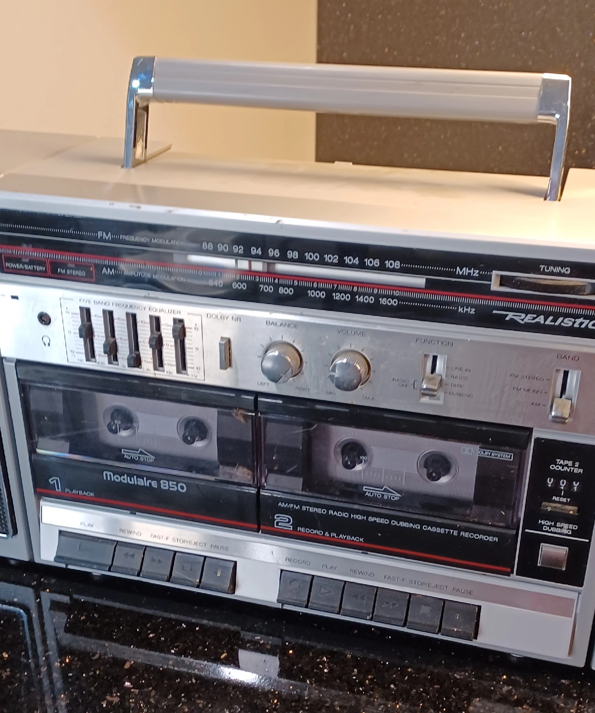 Selling a Realistic Modulaire 850 AM/FM stereo radio and high speed dubbing cassette recorder. It features a five band frequency equalizer and Dolby system. It has both FM and AM radio, and the ability to play and record cassettes. One of the cassette player stop working other wise nothing wrong.