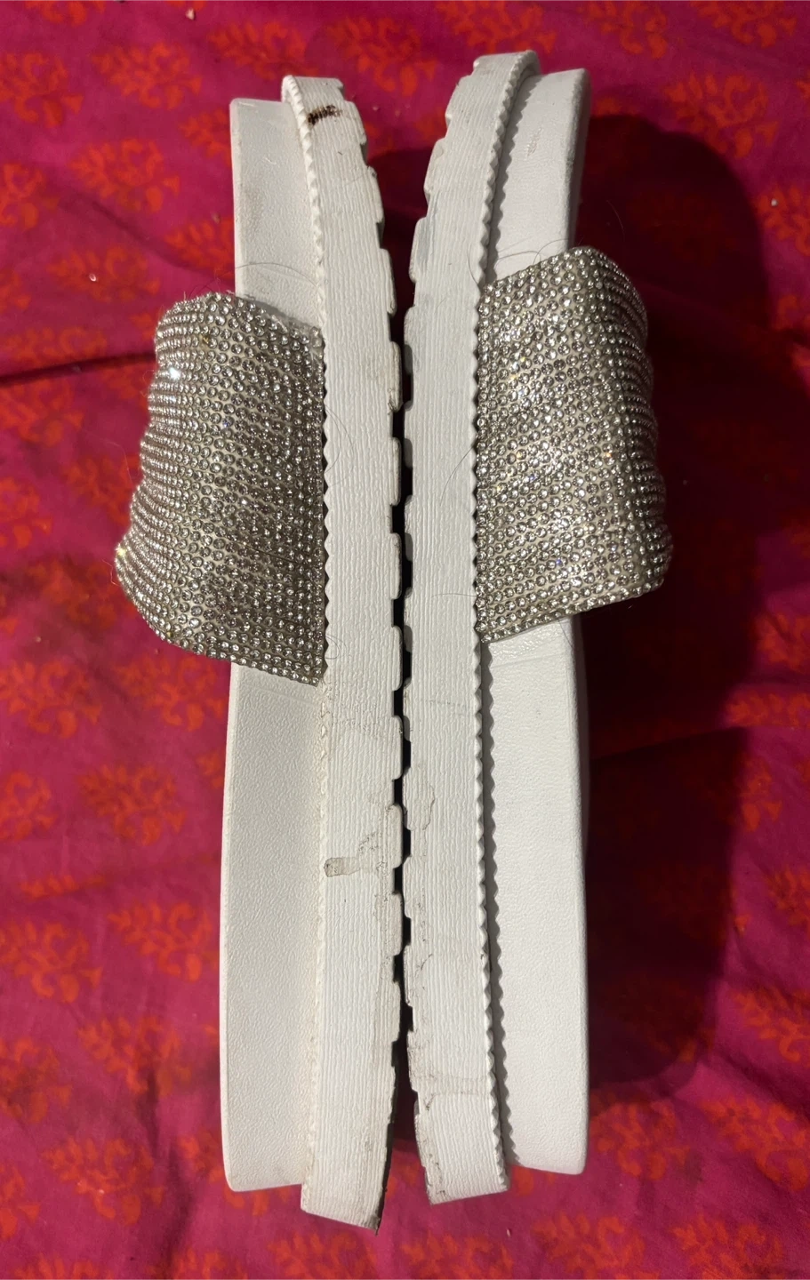 97Selling a pair of Ardene white slides in size 9. They feature a sparkly rhinestone band across the top. These are perfect for adding a bit of bling to your casual outfits. They are in good condition as shown in photos