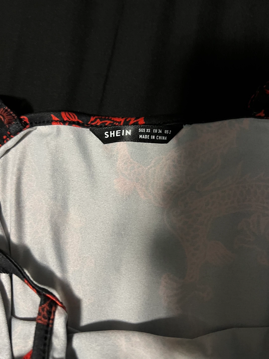 Cute Shein dress with a black background and a red dragon print! It's a size XS and perfect for a night out or a casual day. The material is lightweight and comfortable. It's in great condition, ready for a new home
