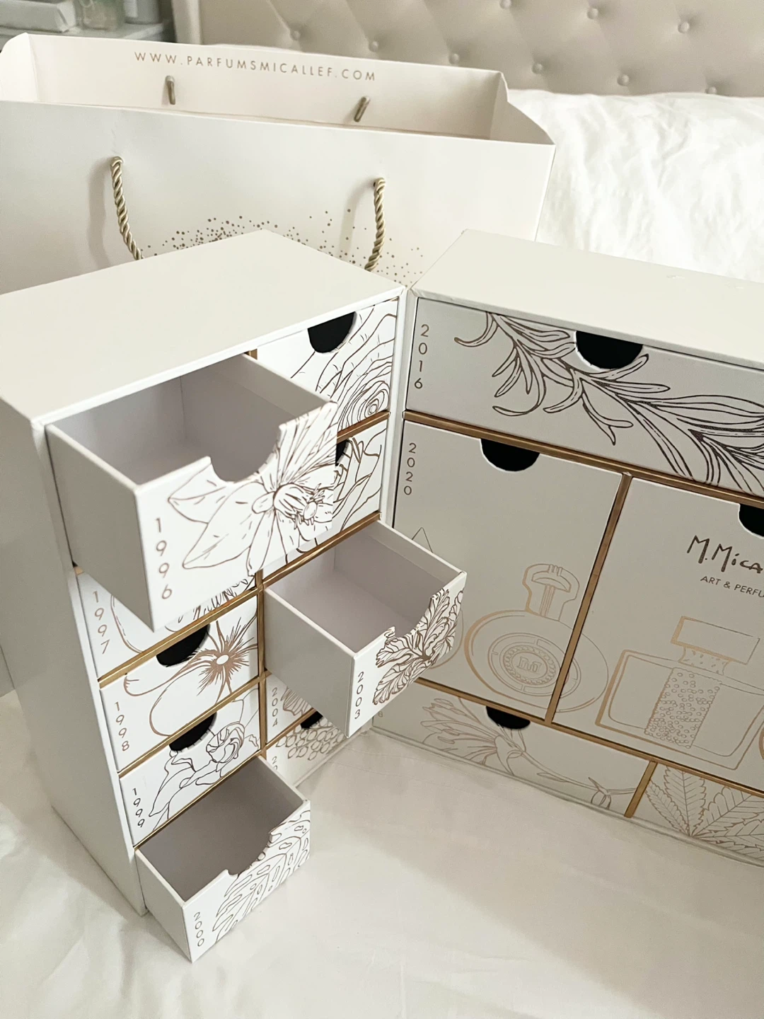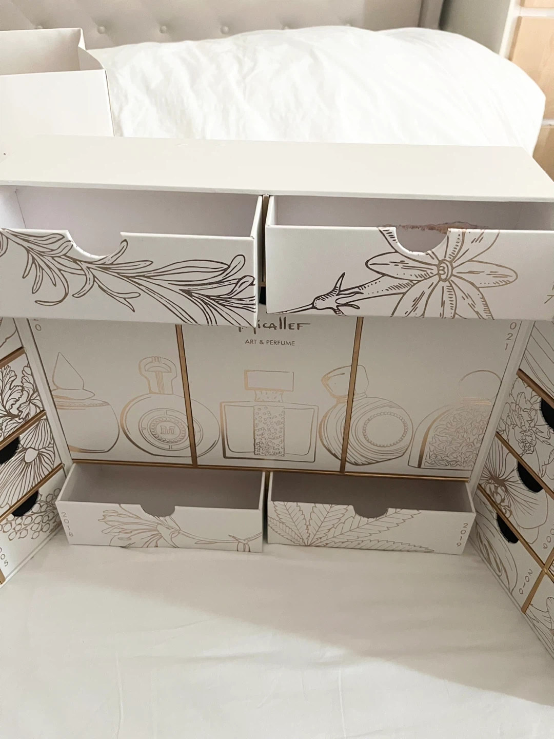 Selling a M.Micallef Olfactive Legends Art & Perfume EMPTY box. This unique box features a beautiful design with drawers, perfect for storing small items or displaying your perfume collection. The box has a white and gold colour scheme and is in good condition.