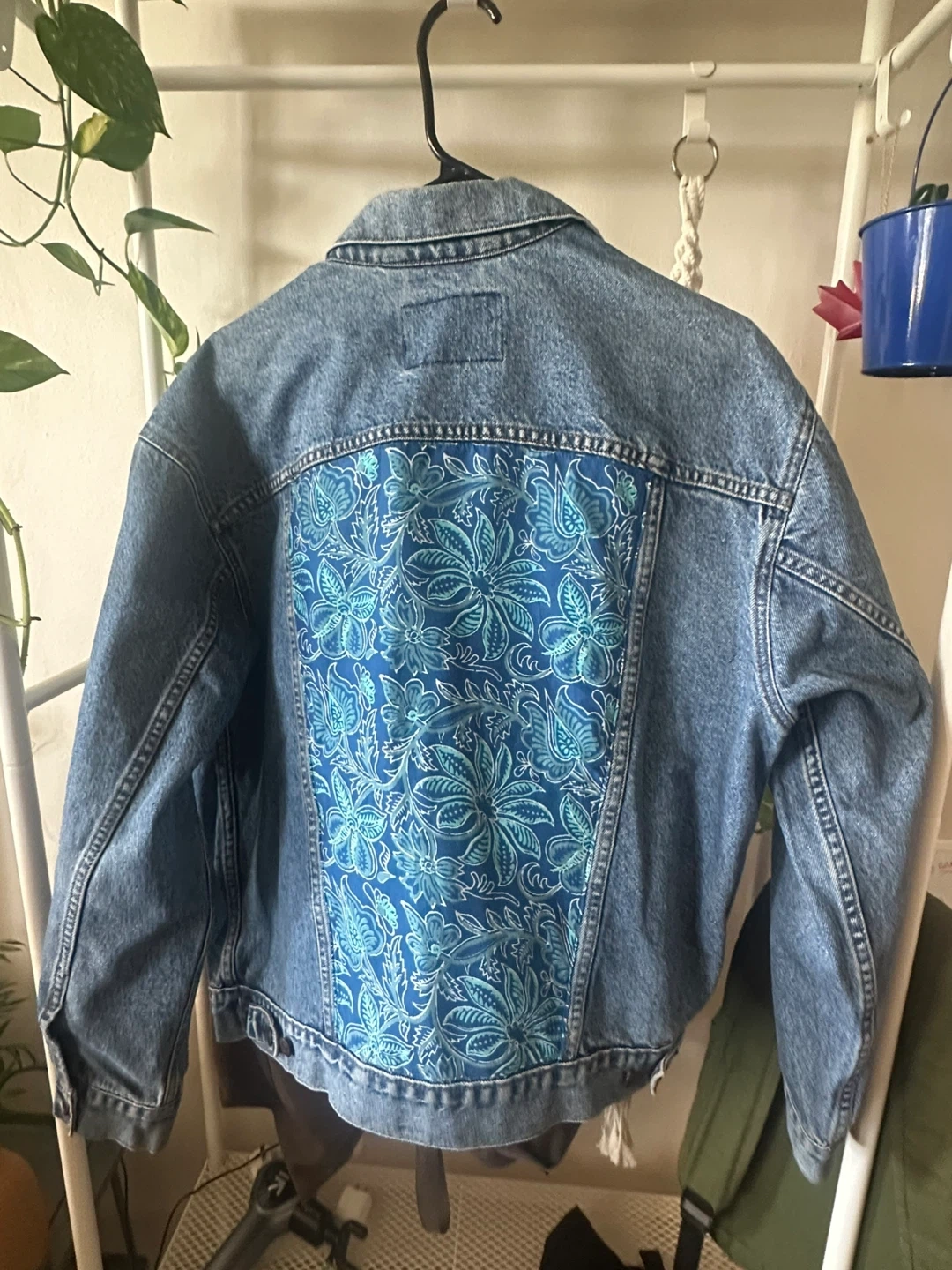 Levi Strauss & Co. Signature denim jacket with a unique floral design on the back. It's in great condition and ready for a new home! The jacket also has some cool pins on the front.