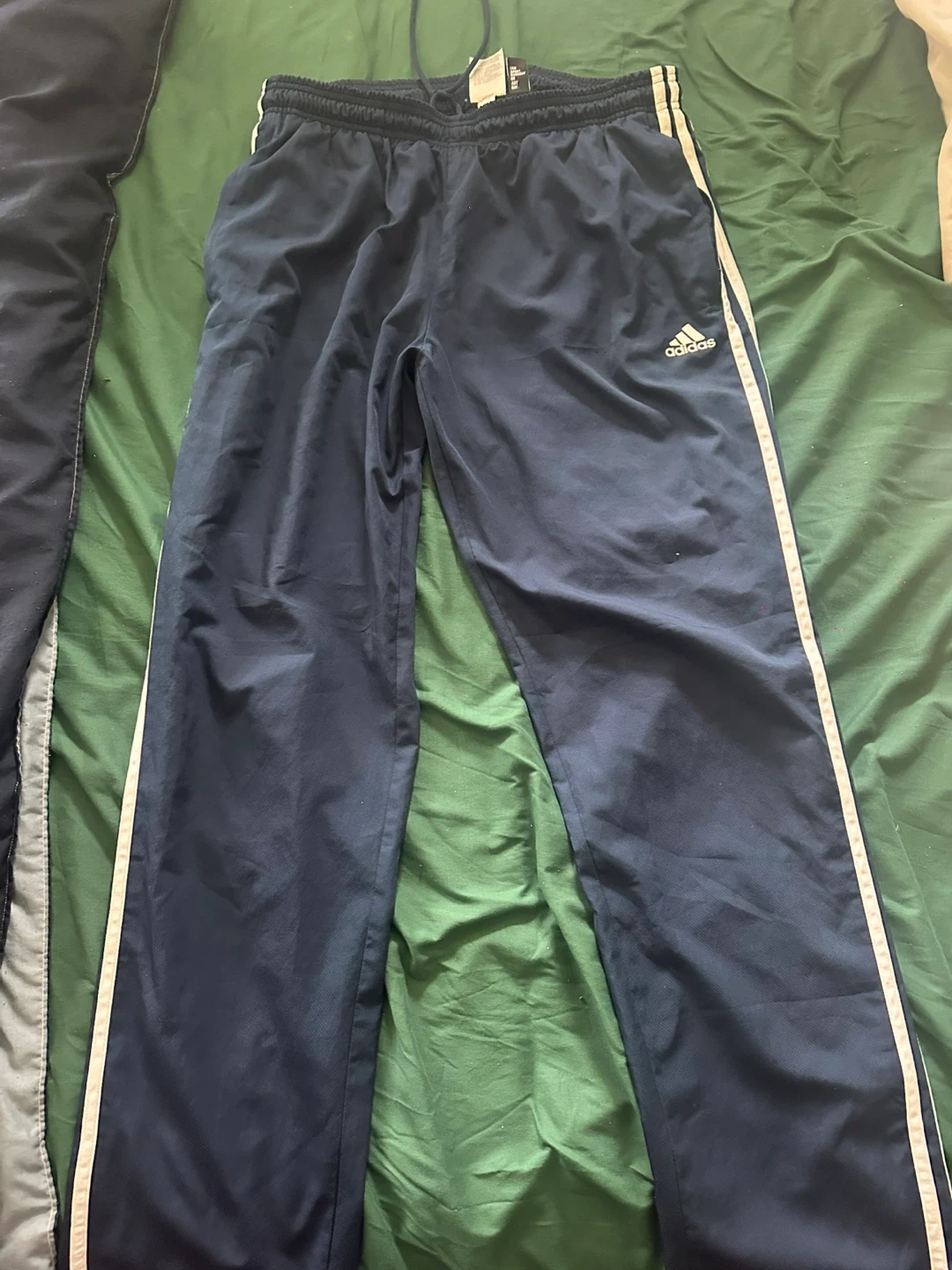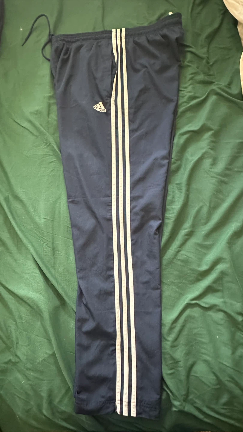 Selling a pair of Adidas navy track pants in size large! They feature the classic three-stripe design. These are perfect for workouts or just lounging around. The material is comfy and durable. Grab them while you can!