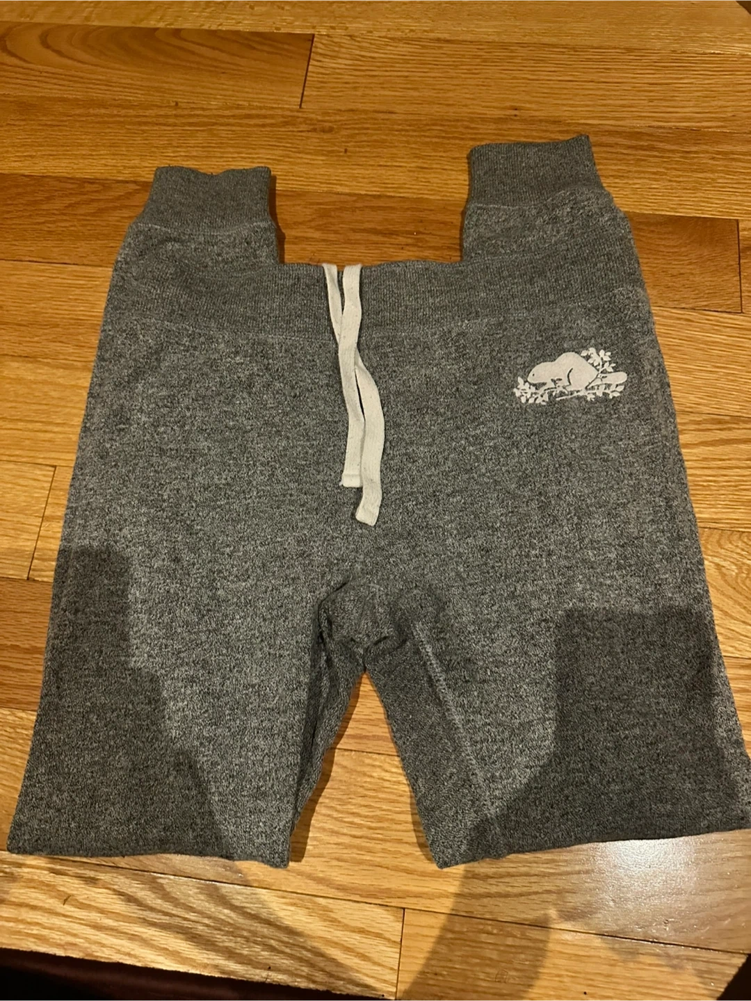 Cozy Roots sweatpants in a grey pepper colour! They're a size small and made with a soft fleece material. Perfect for lounging around or running errands Size small