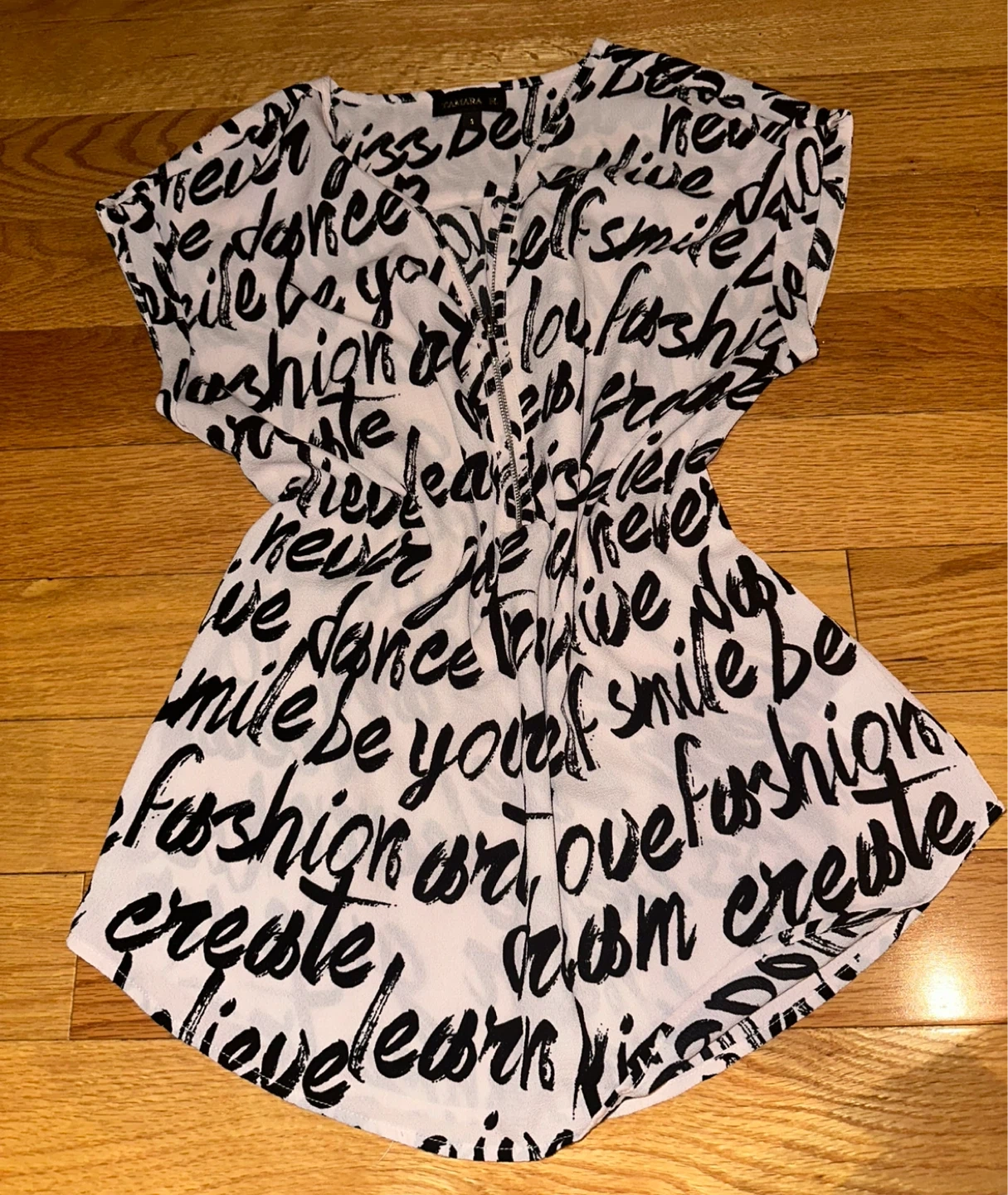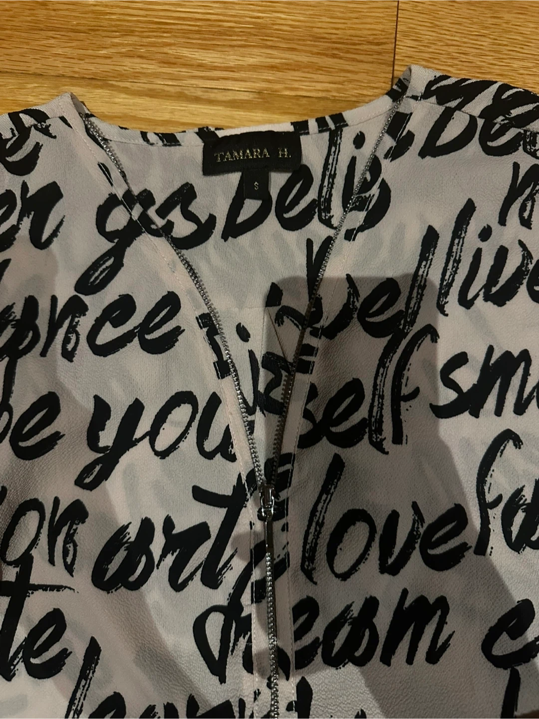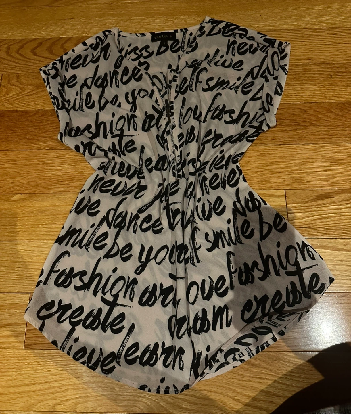 This is a Tamara H. blouse in a size small! It features a unique black and white print with various words. The material is lightweight and comfortable, perfect for everyday wear