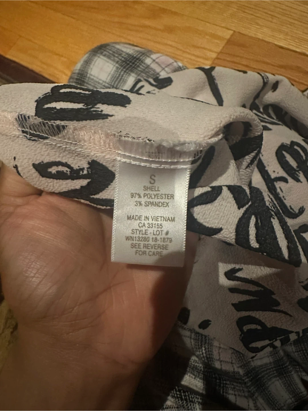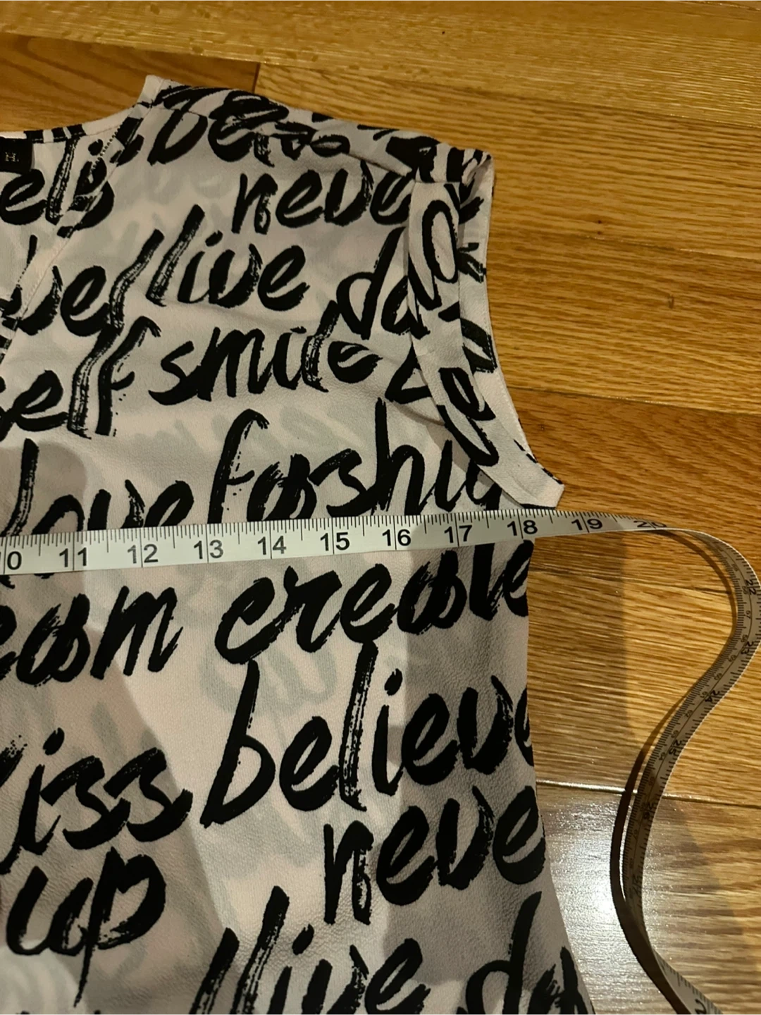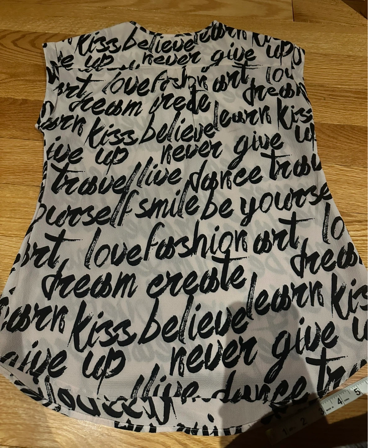 This is a Tamara H. blouse in a size small! It features a unique black and white print with various words. The material is lightweight and comfortable, perfect for everyday wear