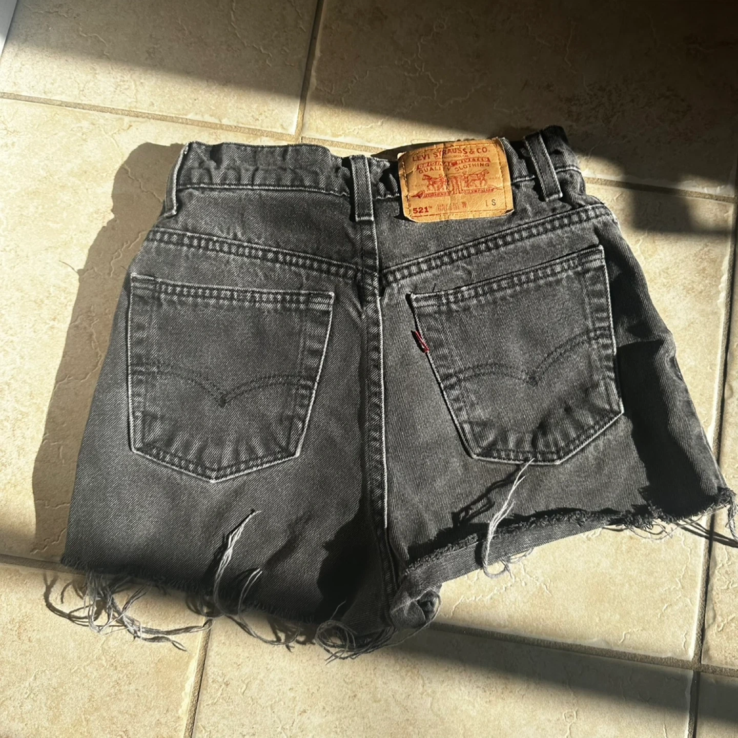 Selling a pair of Levi's 521 denim shorts in a stylish black colour. They are a size 4 and have a tapered fit with a tapered leg. Perfect for a casual, edgy look!